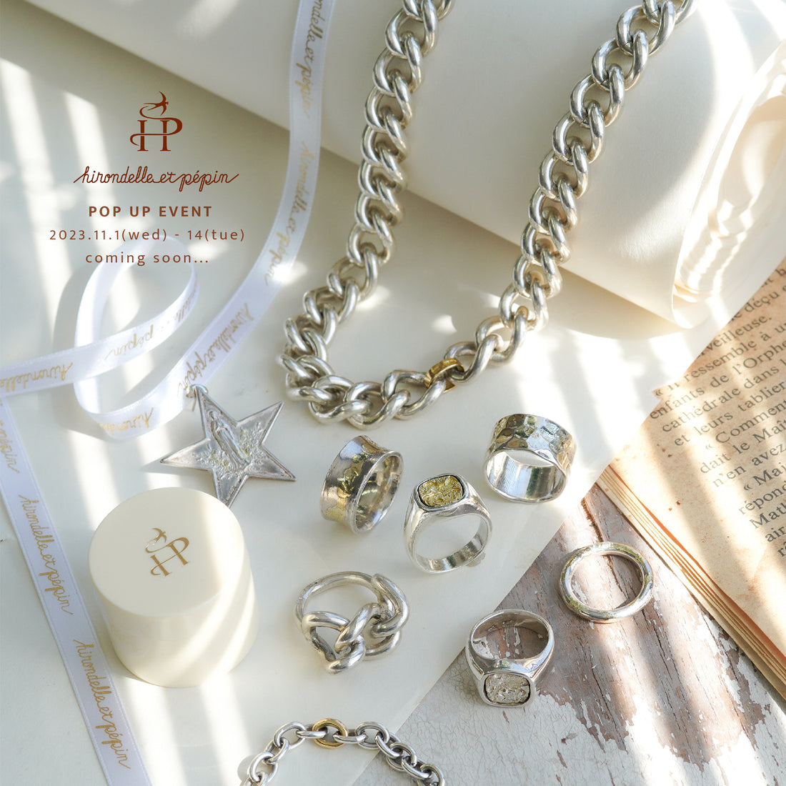 ◼︎information 〈 阪急うめだ本店 期間限定POP UP EVENT 〉 【日時】2023年11月1日(水)-14日(火) 【場所】阪急梅田本店 1階アクセサリーイベントスペース2 阪急うめだ本店1階にて単独ポップアップイベントを開催します。hirondelle et pépinのコレクションのほぼ全てのアイテムをオーダーできる他、1点ものやオンライン限定アイテム、イベント用の特別なアイテムも展開予定です。hirondelle et pépinをご存知の方も、初めての方も楽しめるイベントになるよう心掛けています。関西の皆さん、ぜひ2週間のイベントに遊びにいらしてくださいね。 --------------------------------お問い合わせがございましたらこちらまでお願い致します。 Instagram Online storeもあわせてご覧くださいませ♩--------------------------------