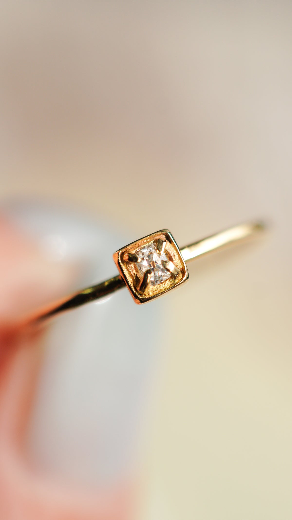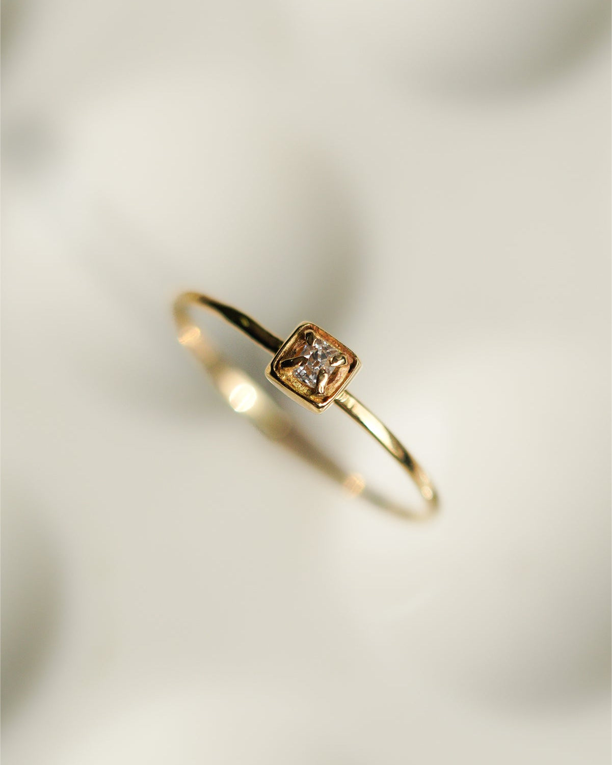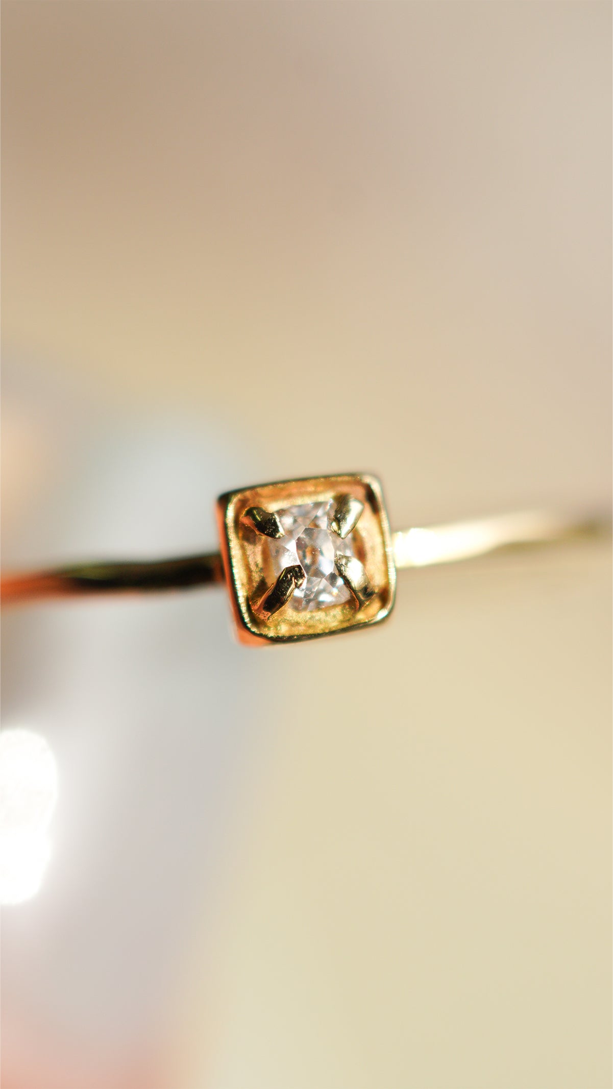 小さなスクエアの石座に留めたシンプルなデザインは、アンティークダイヤモンドの魅力をさりげなく引き立てます。