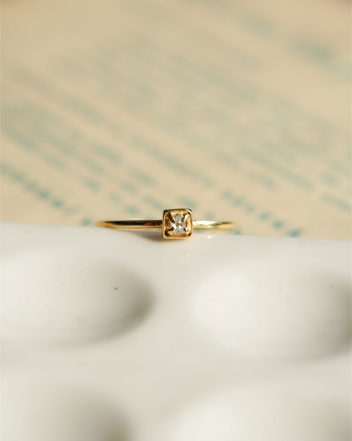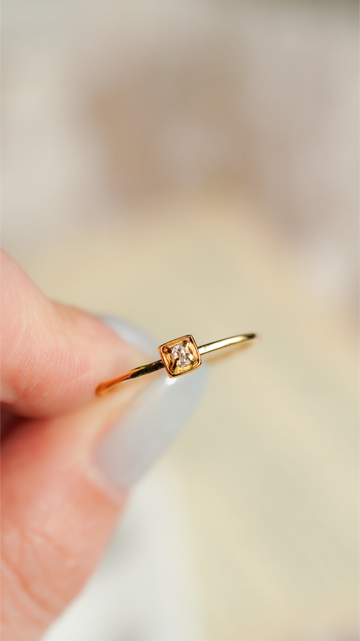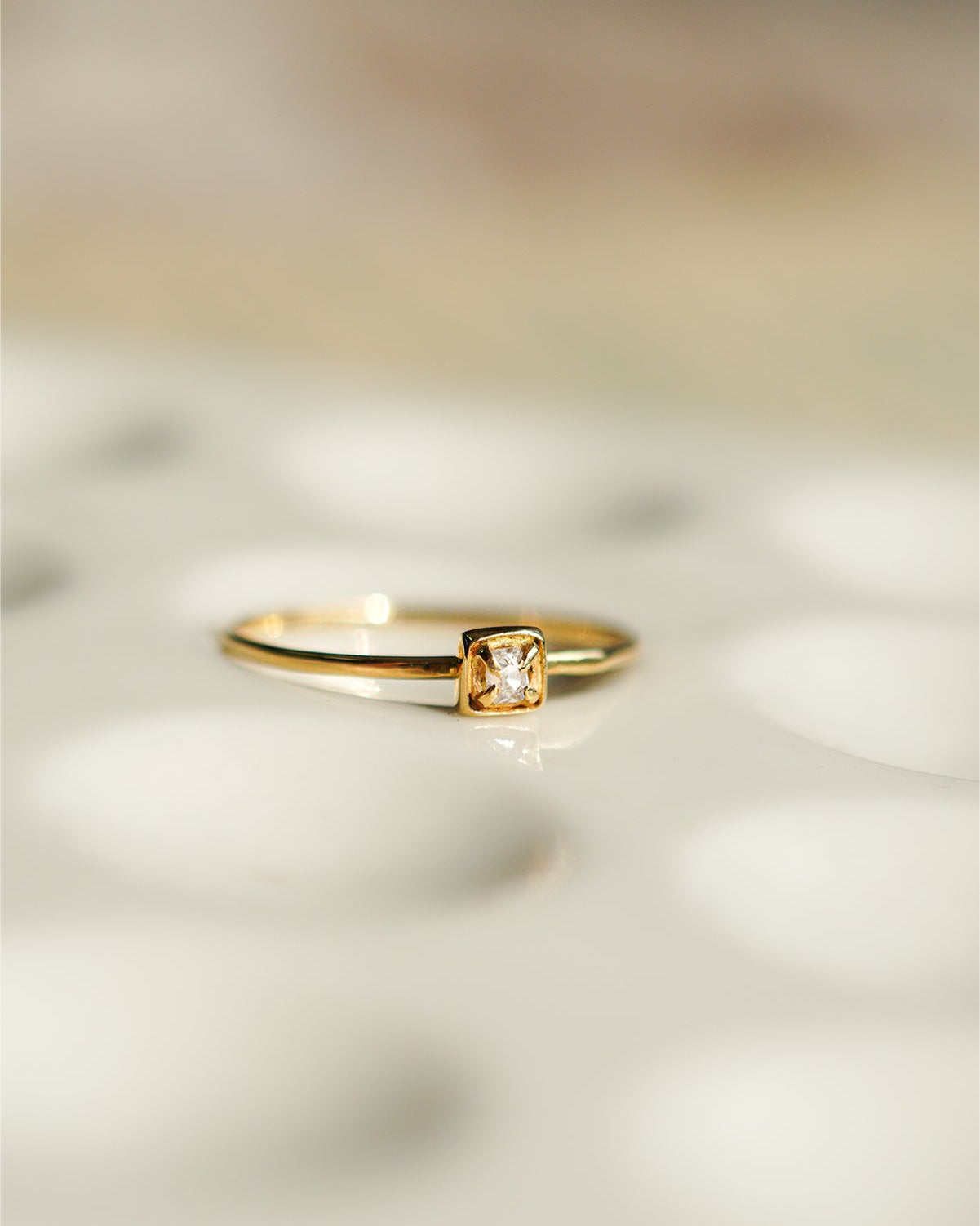 小さなスクエアの石座に留めたシンプルなデザインは、アンティークダイヤモンドの魅力をさりげなく引き立てます。