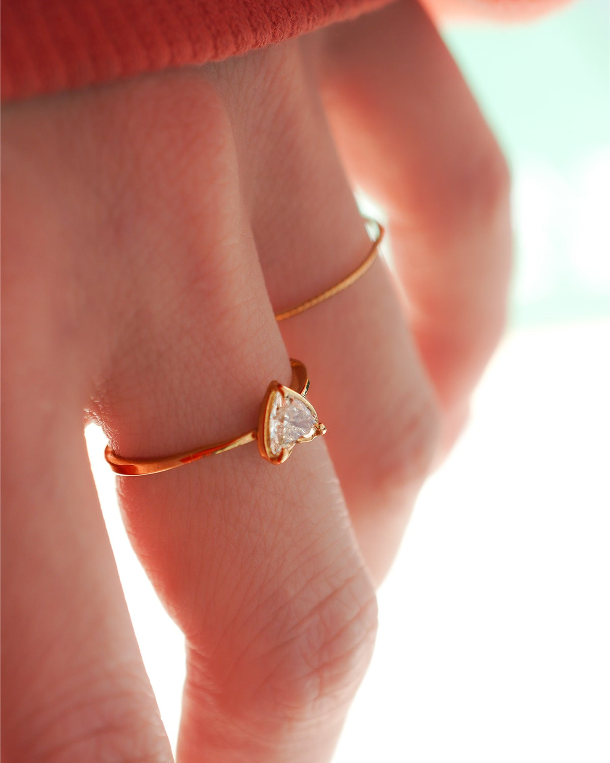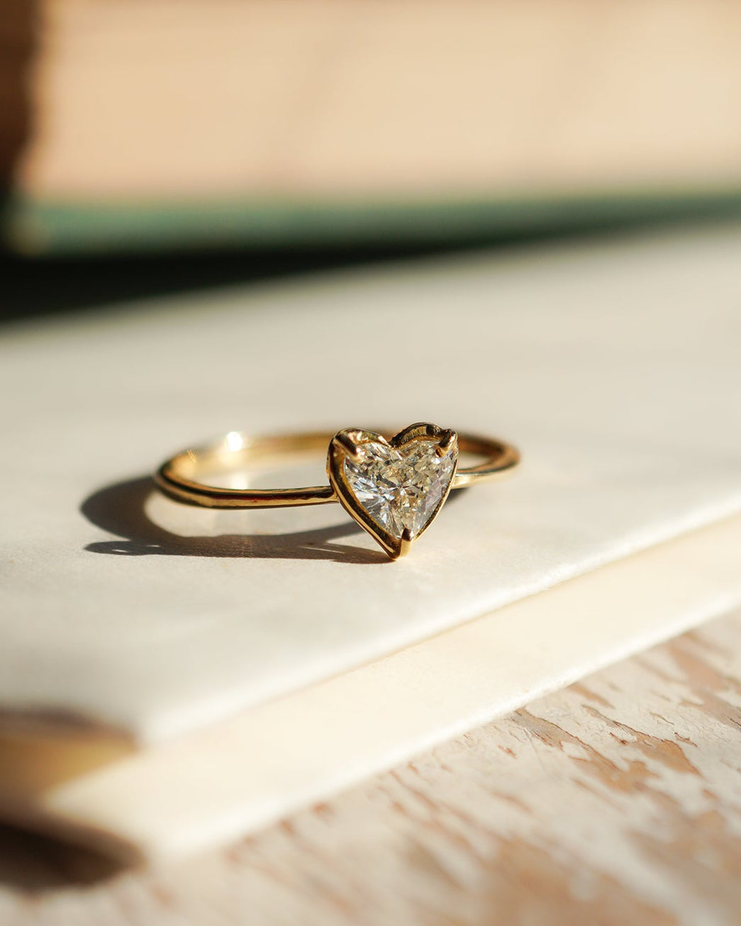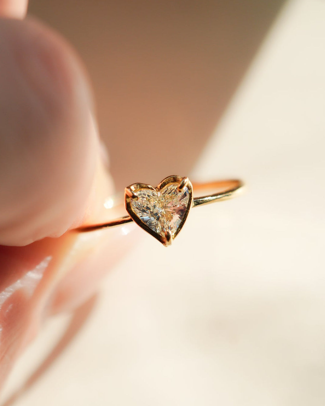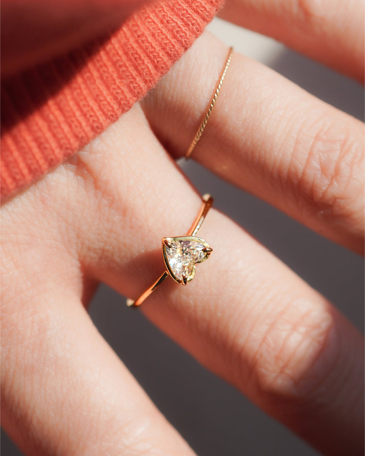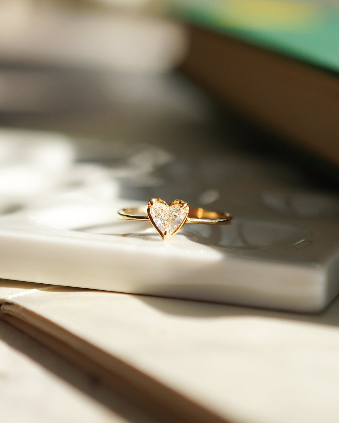 ハートシェイプカットのダイヤモンドを留めた、繊細なリング。甘さを抑えたハートのかたちは、直線と丸みがほどよく混ざり合い、指先に静かな輝きを添えます。