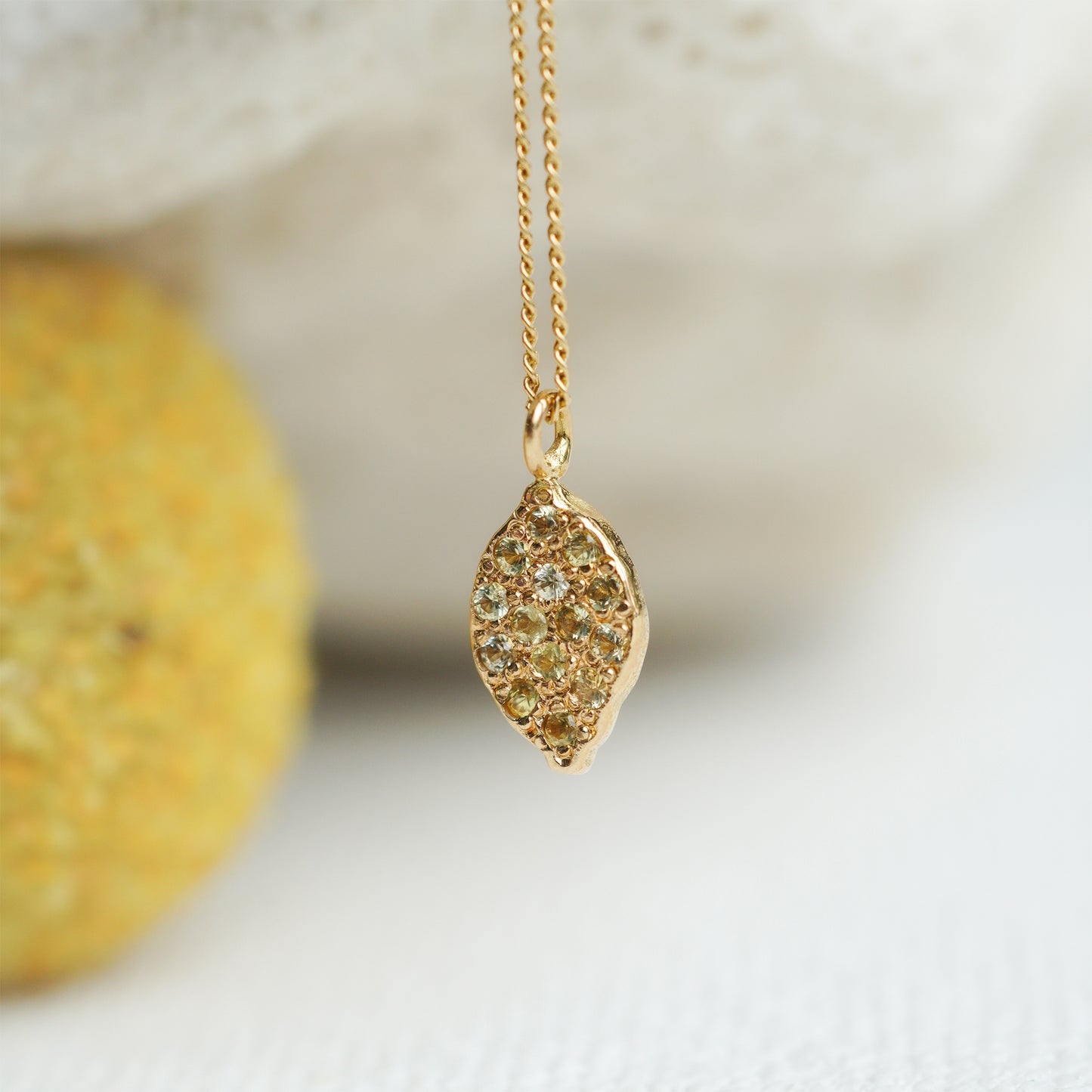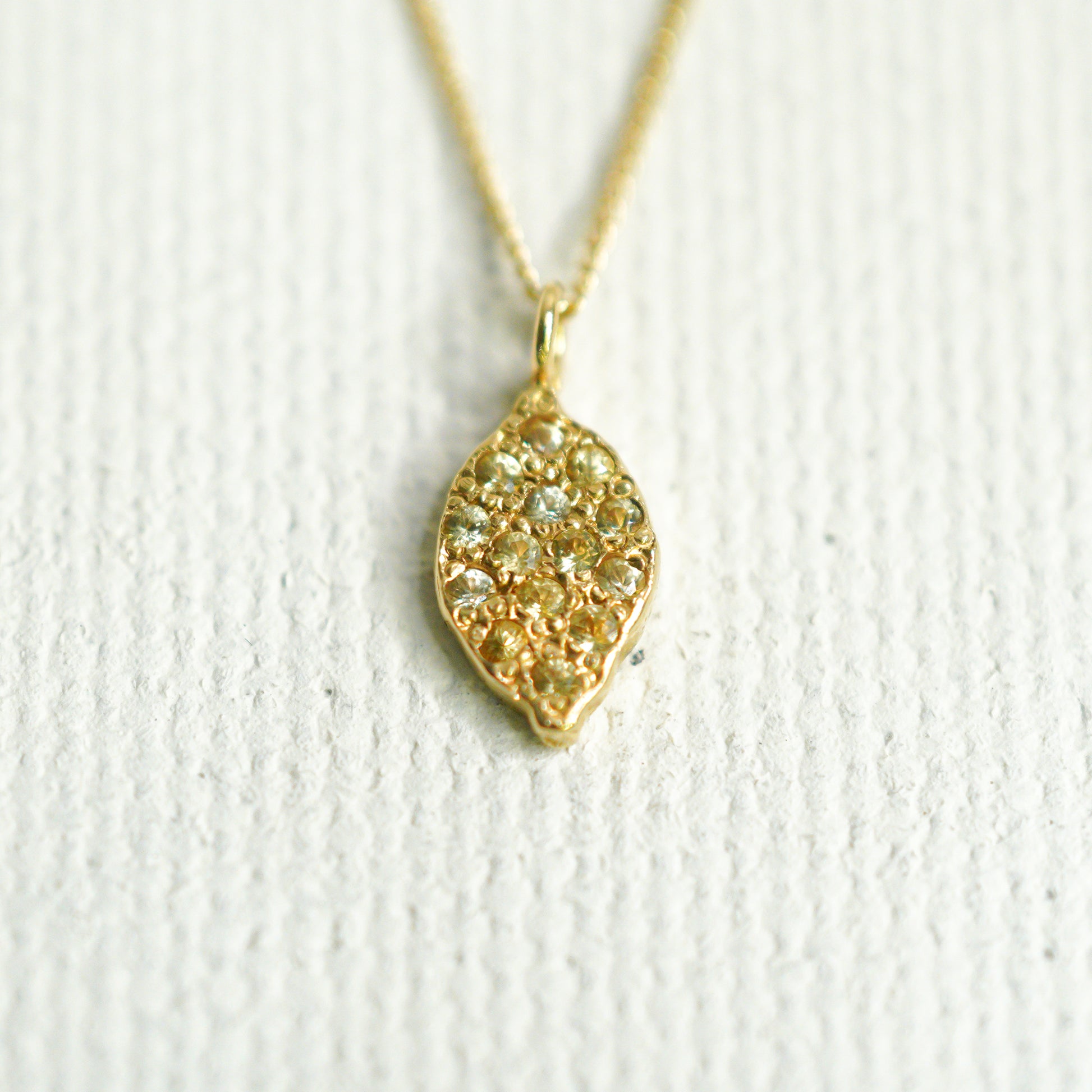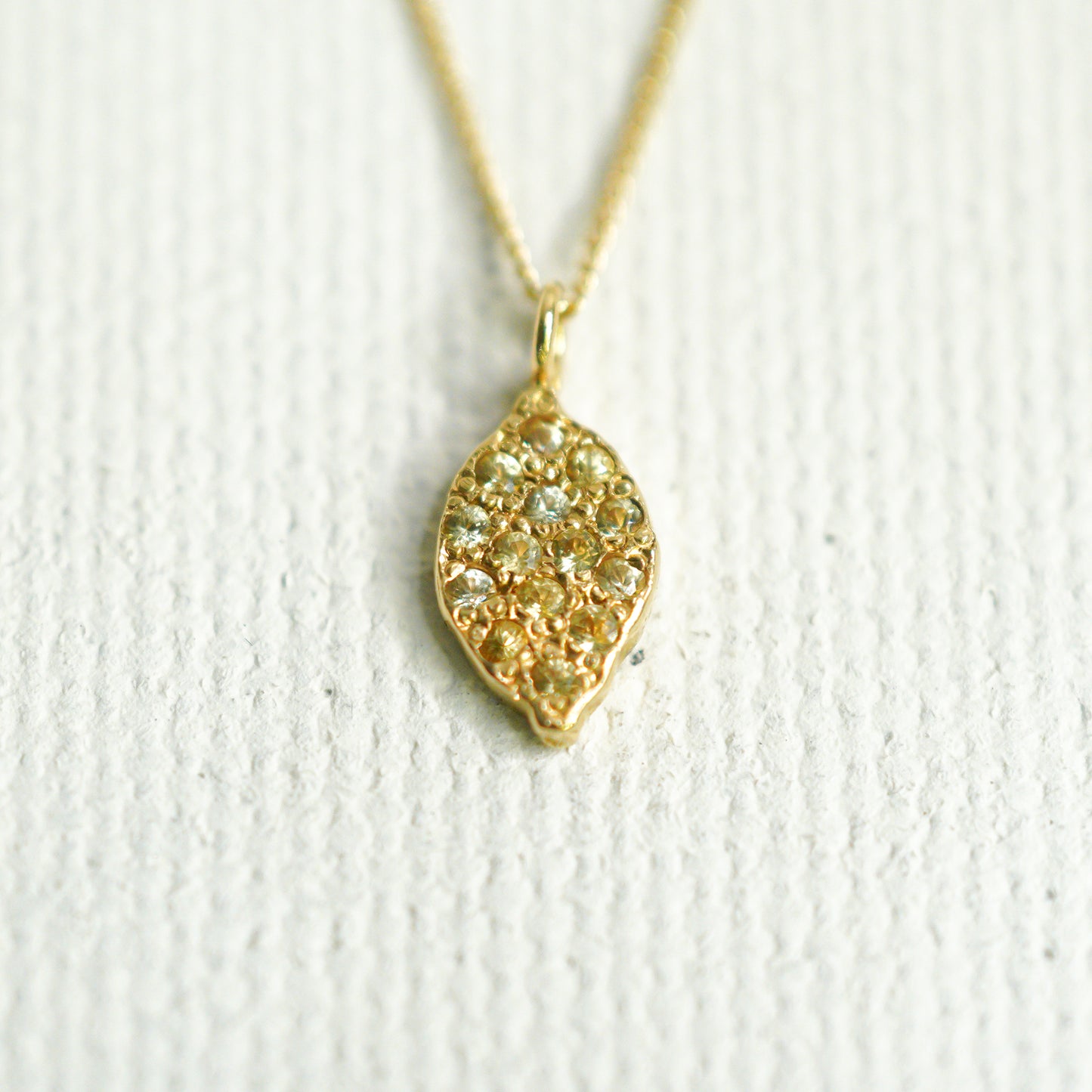 みずみずしいフルーツらしさが表現されたイエローサファイヤのk18ゴールドのレモンネックレス。フルーティーな小ぶりモチーフが大人可愛く、遊び心を足したいときにぴったりです。