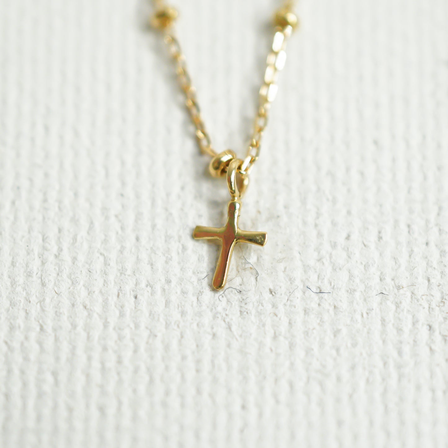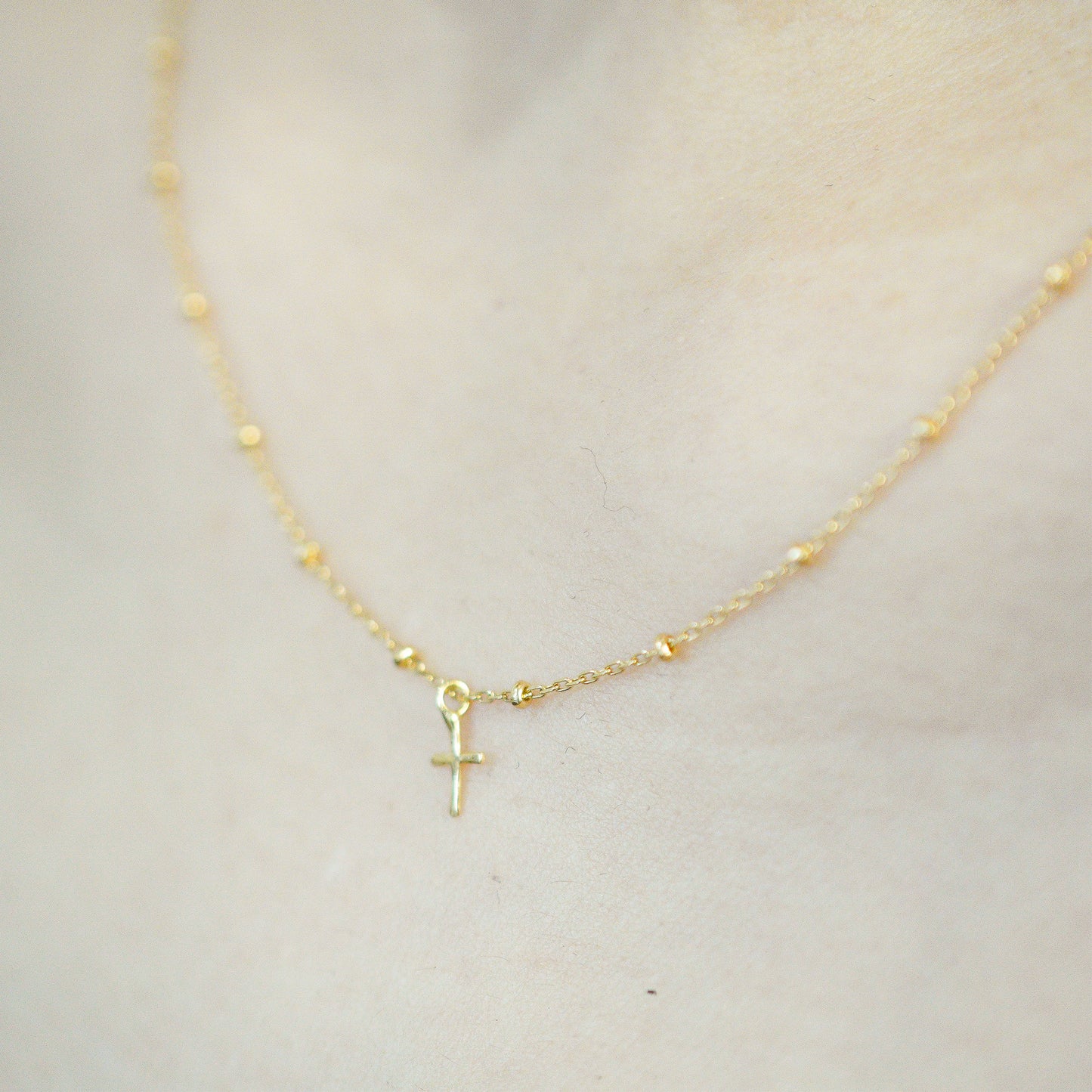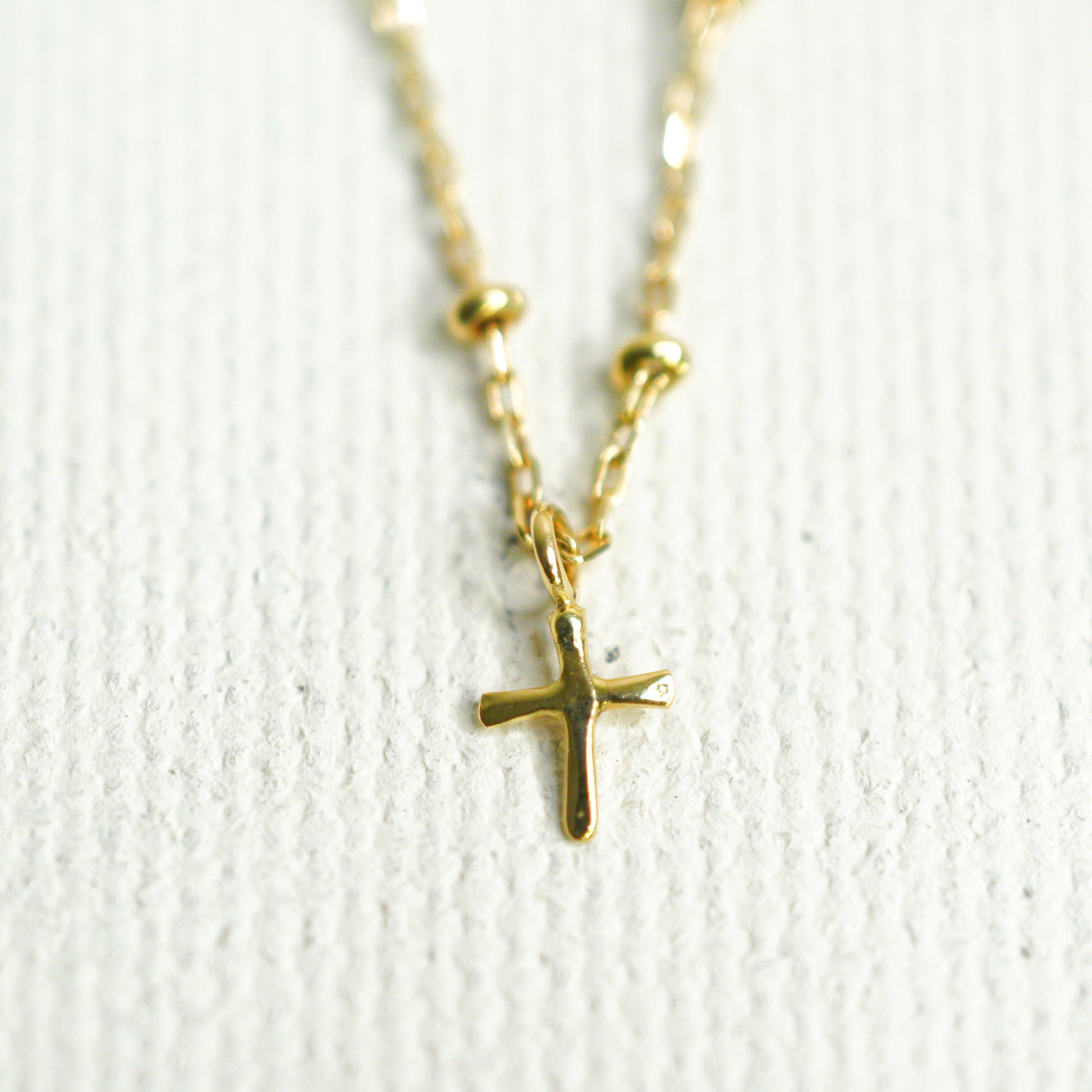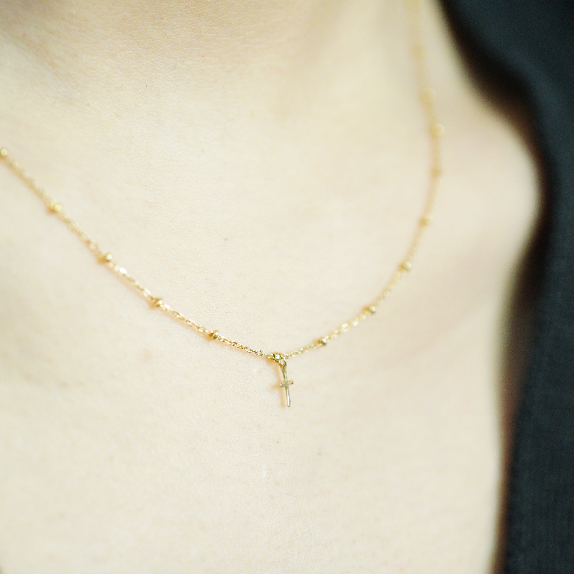 小さなクロスモチーフと飾りのついたチェーンが印象的なネックレス。