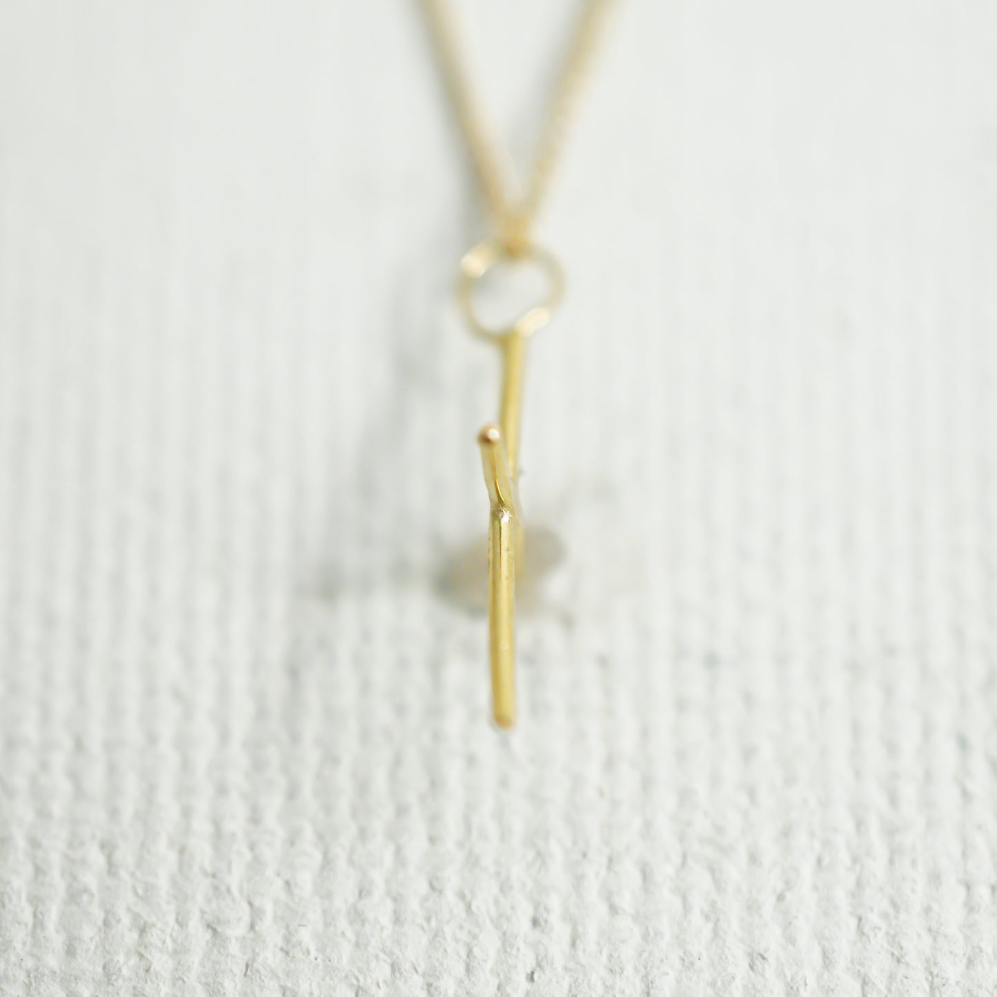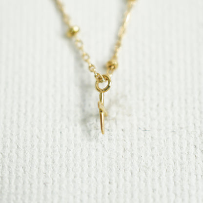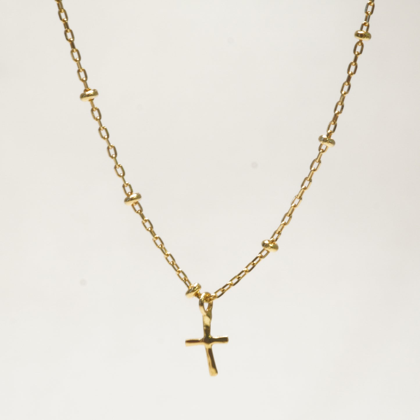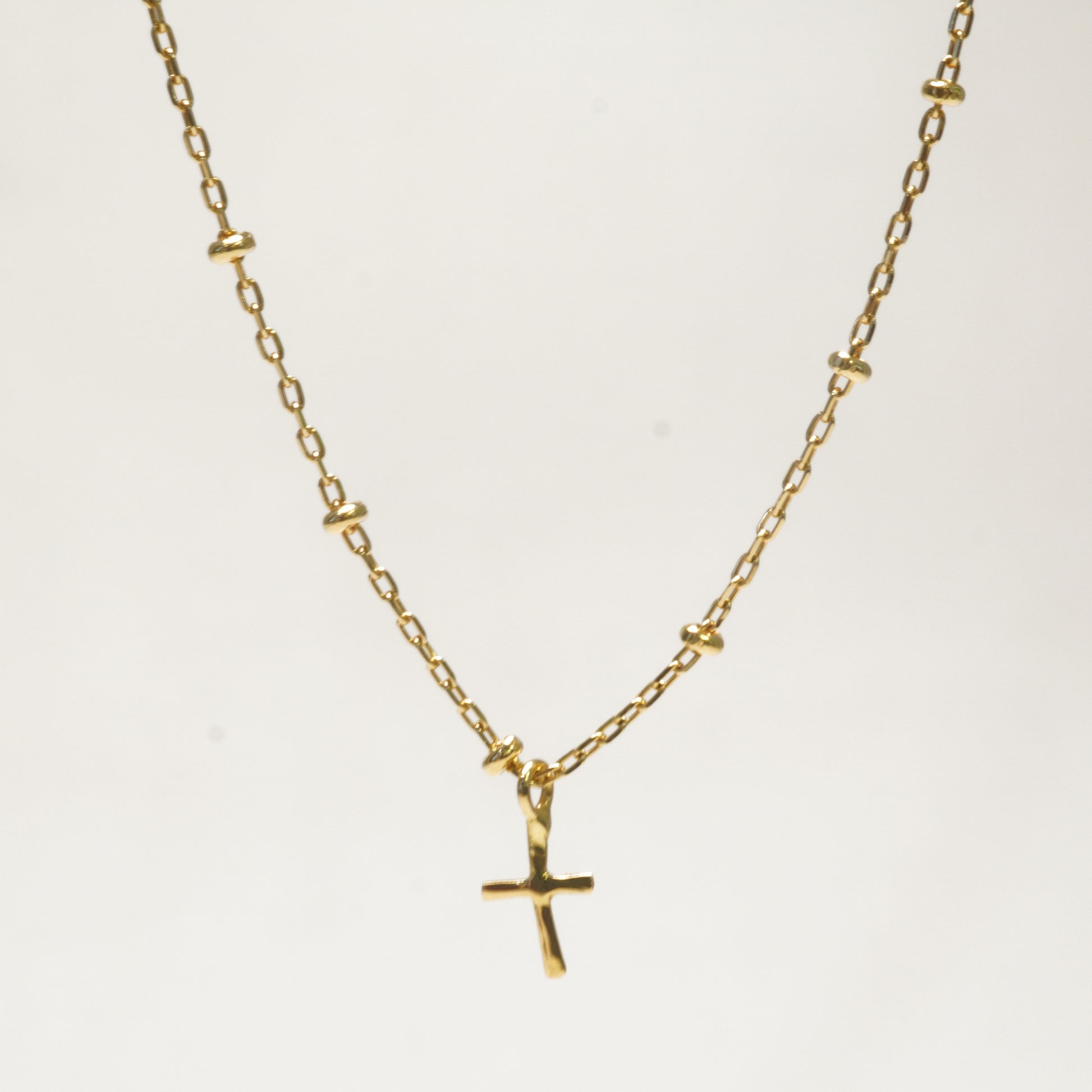 小さなクロスモチーフと飾りのついたチェーンが印象的なネックレス。