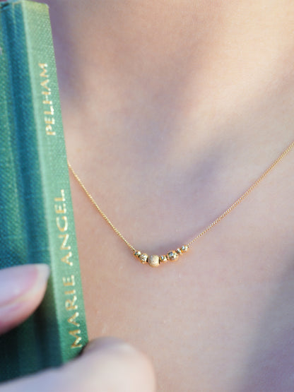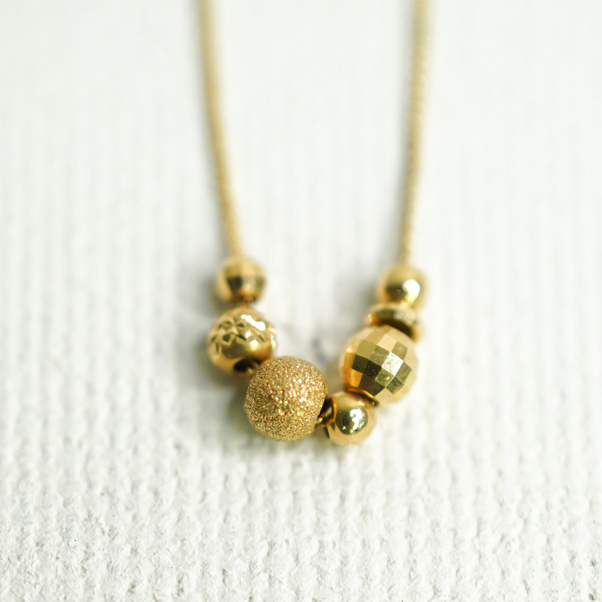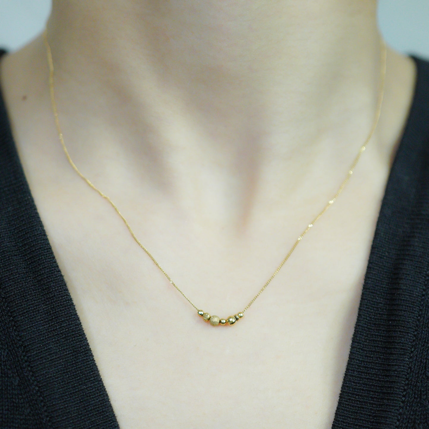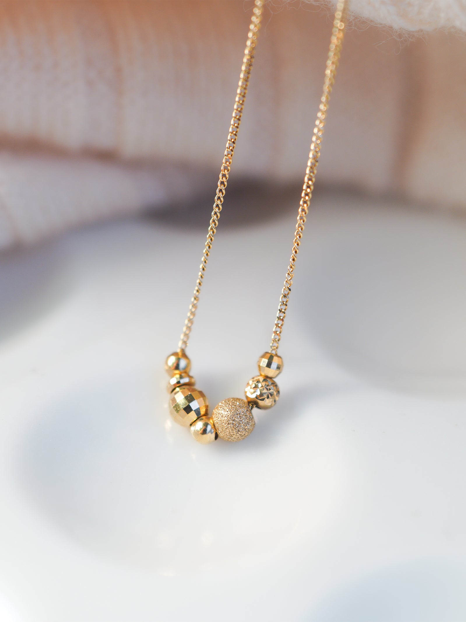 異なるカッティングや磨きを施したボールモチーフが動くたびにキラキラと輝くネックレス。