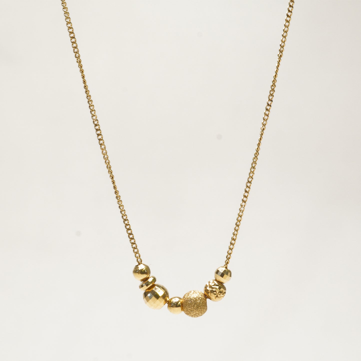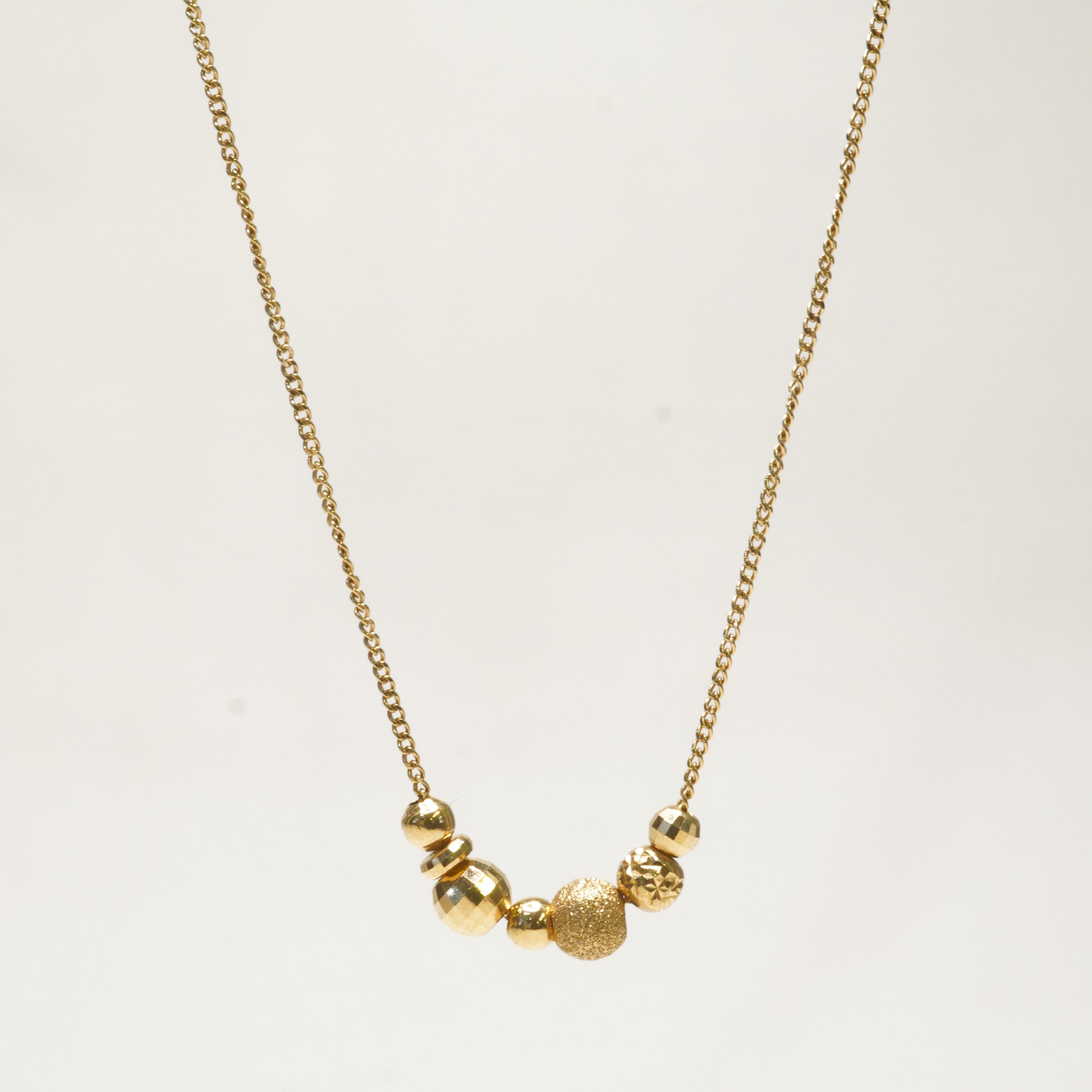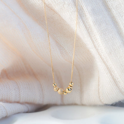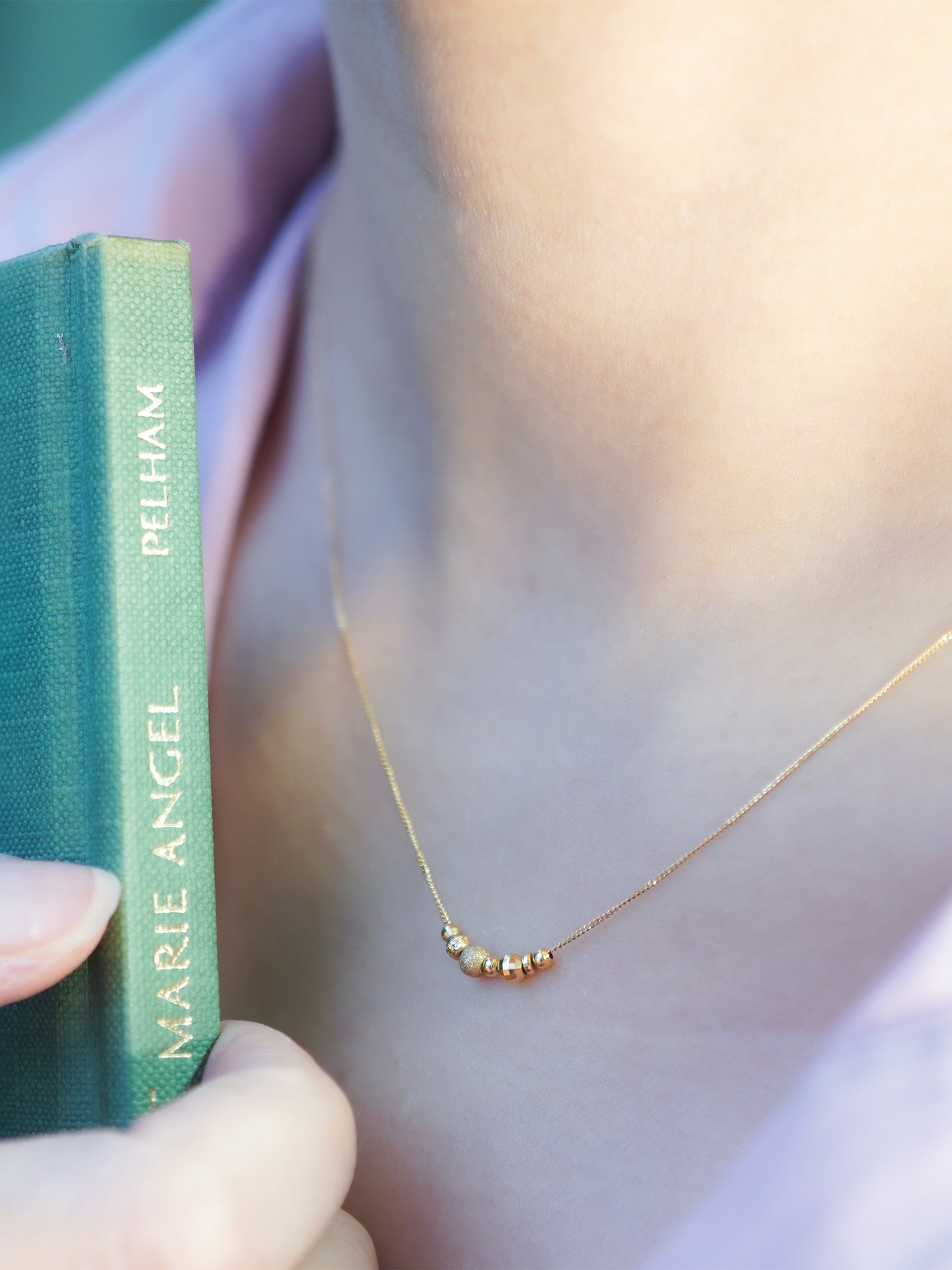 異なるカッティングや磨きを施したボールモチーフが動くたびにキラキラと輝くネックレス。