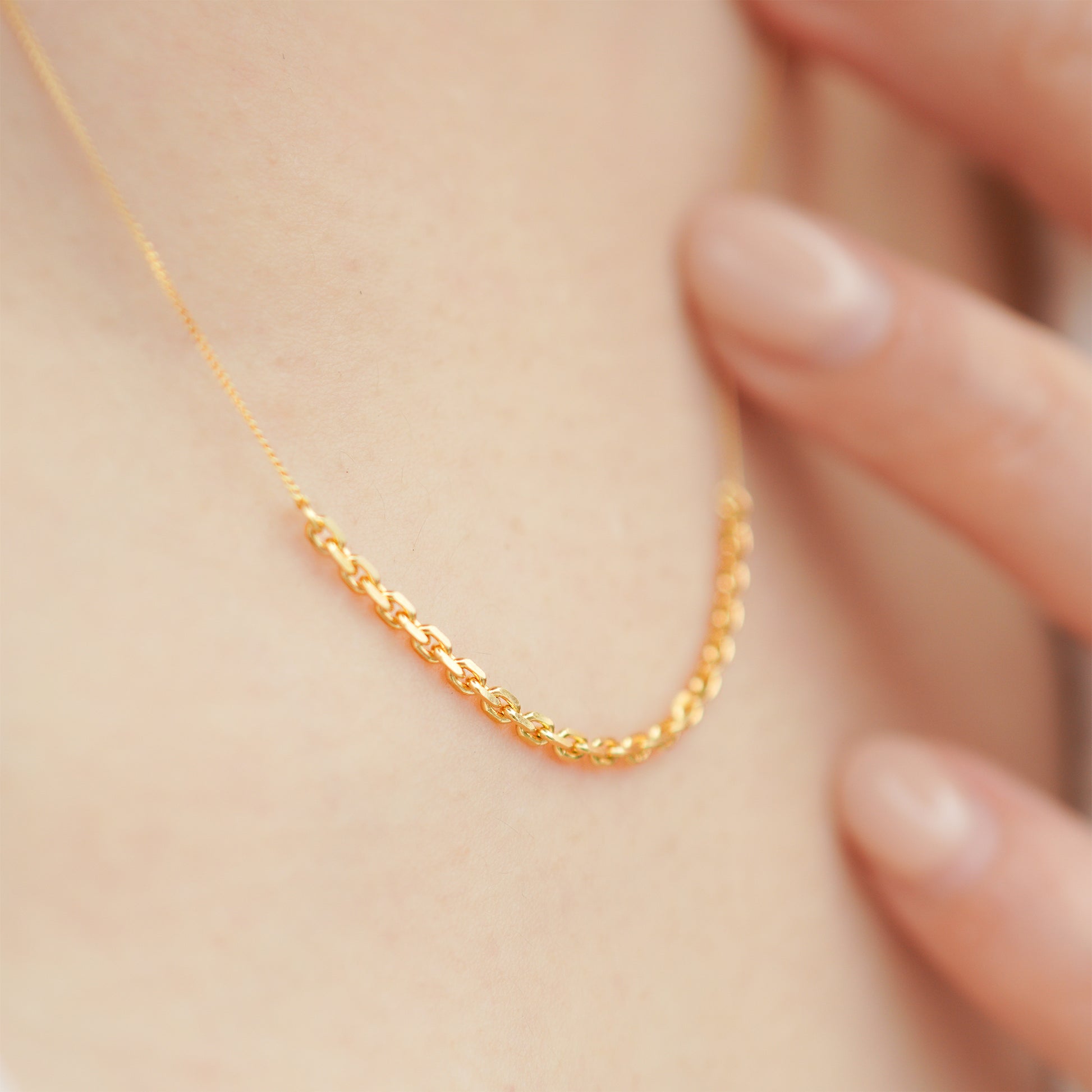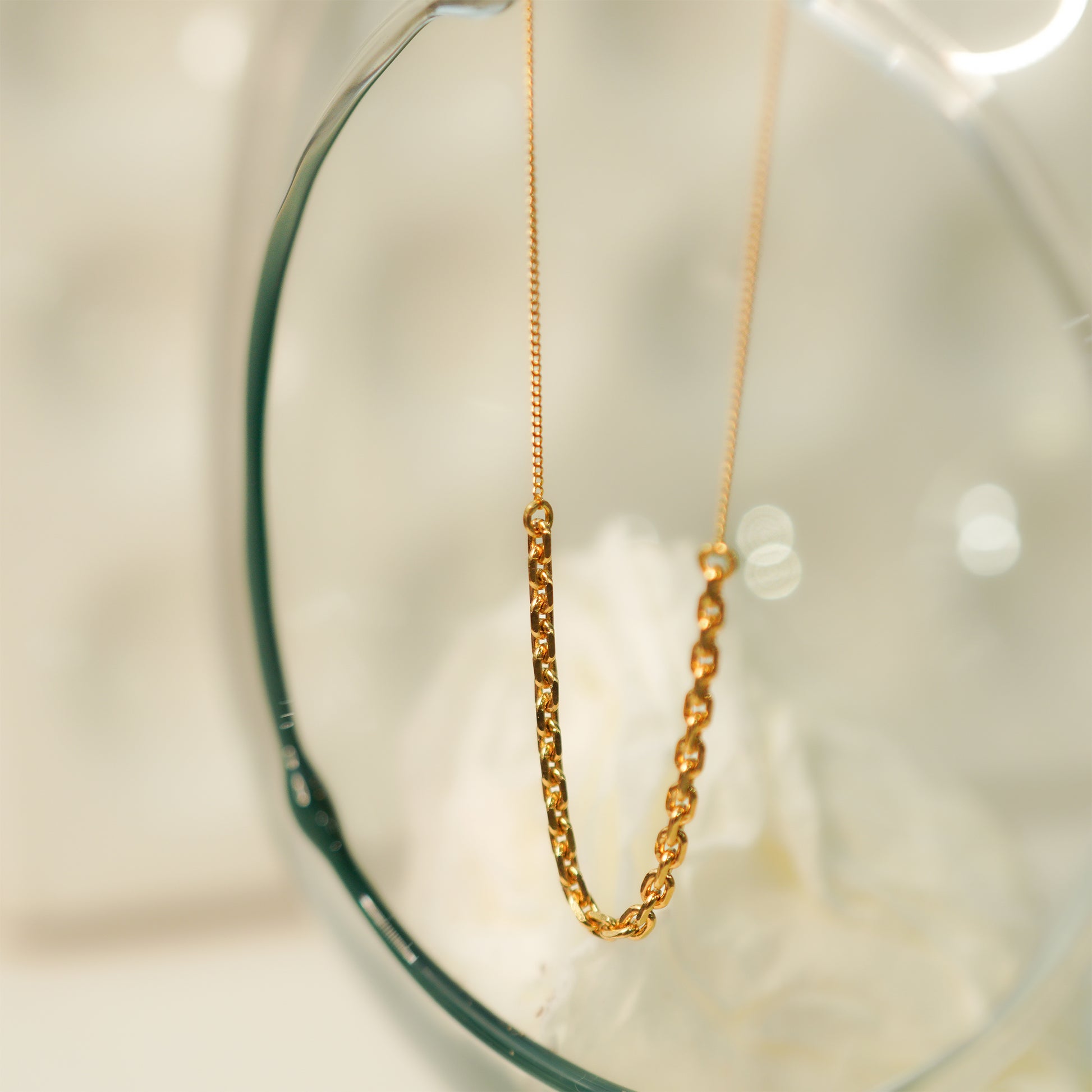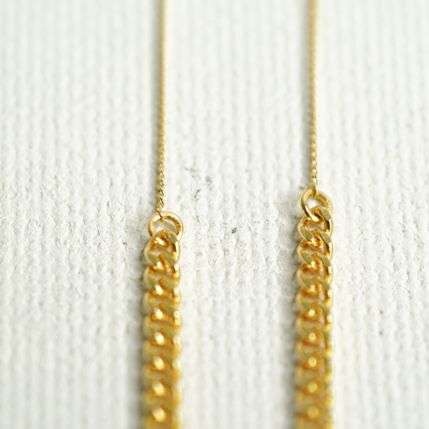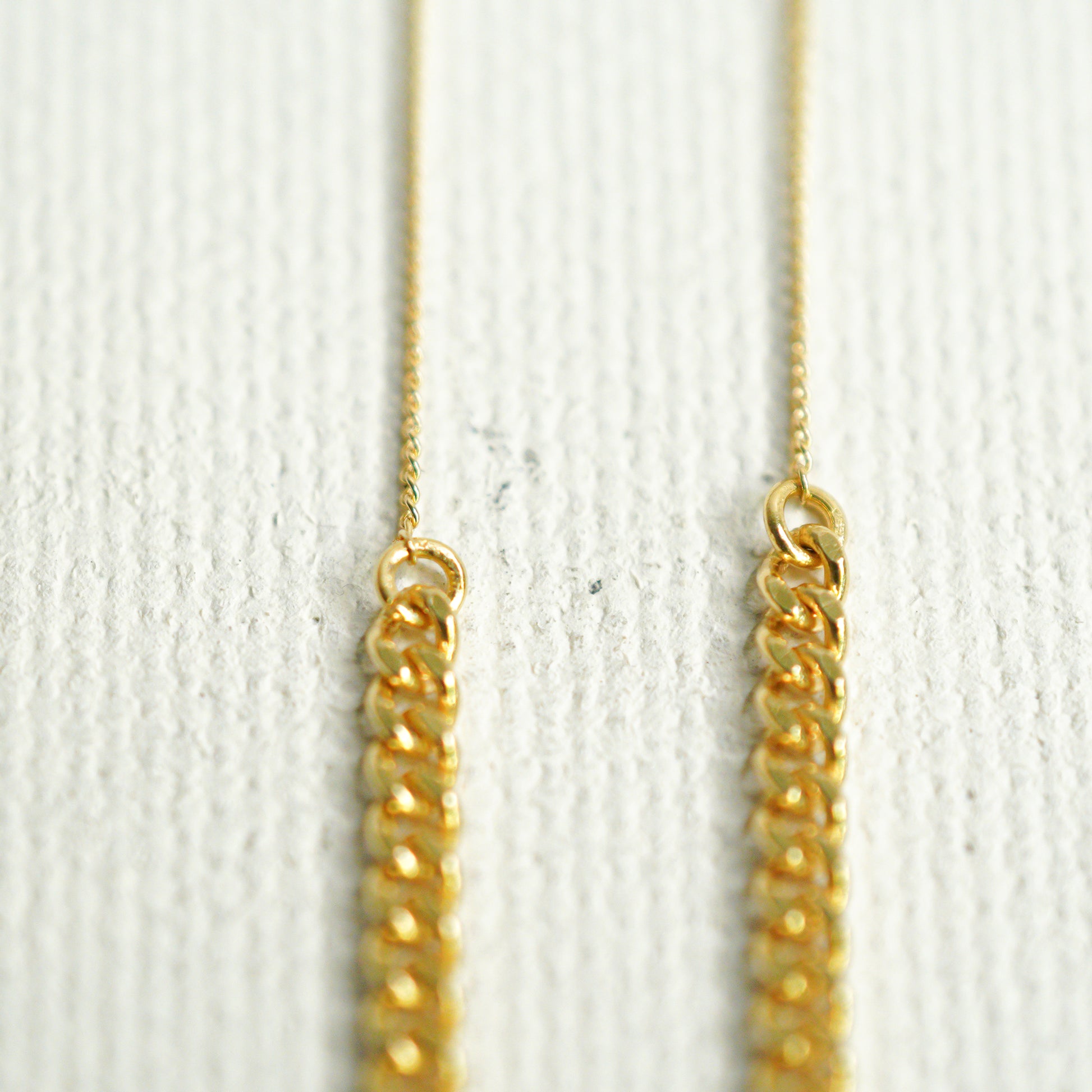 種類の違うシンプルなチェーンを連ねたネックレス。