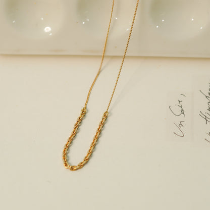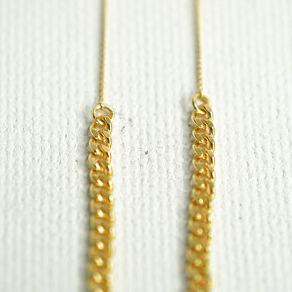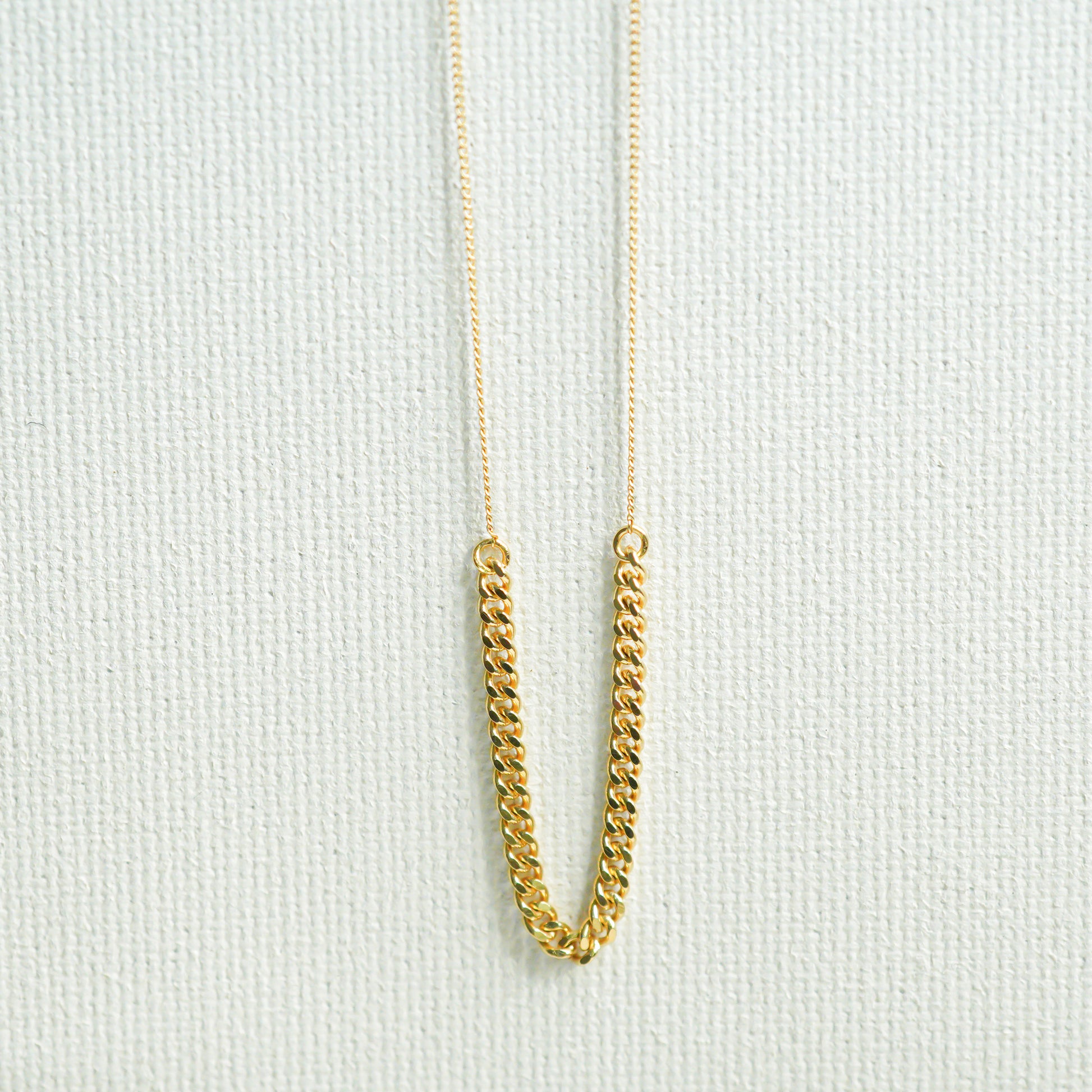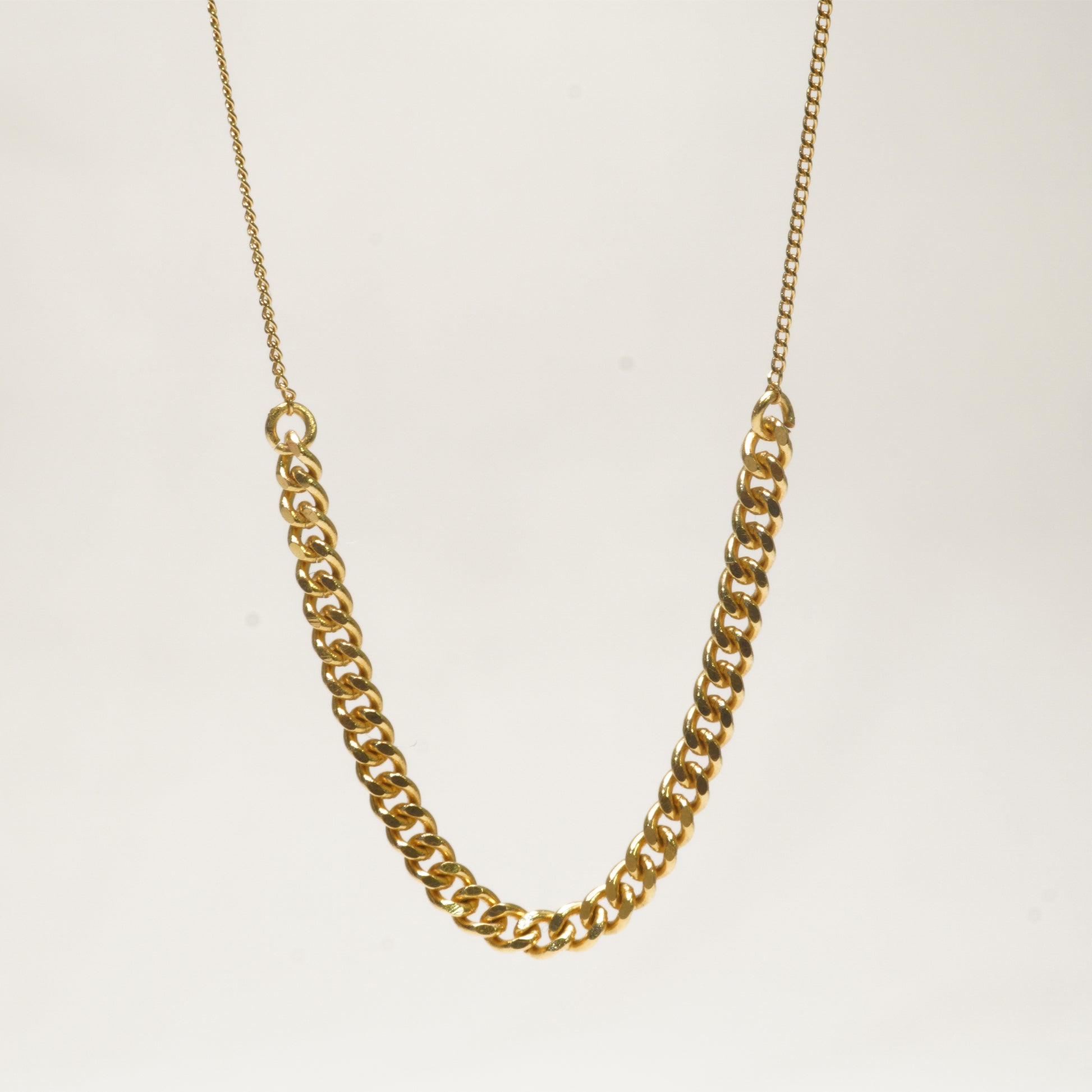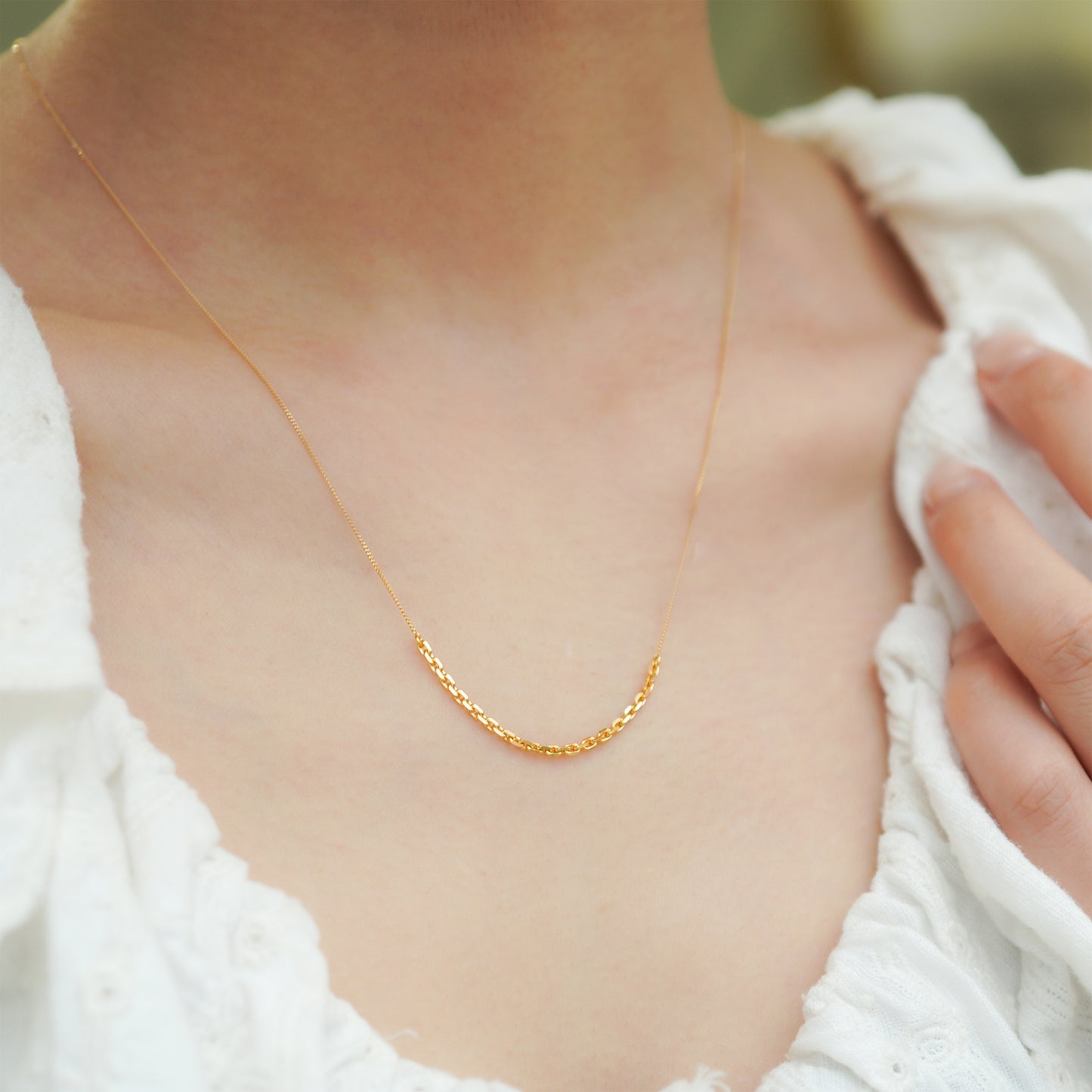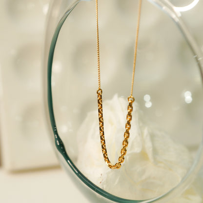 種類の違うシンプルなチェーンを連ねたネックレス。