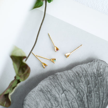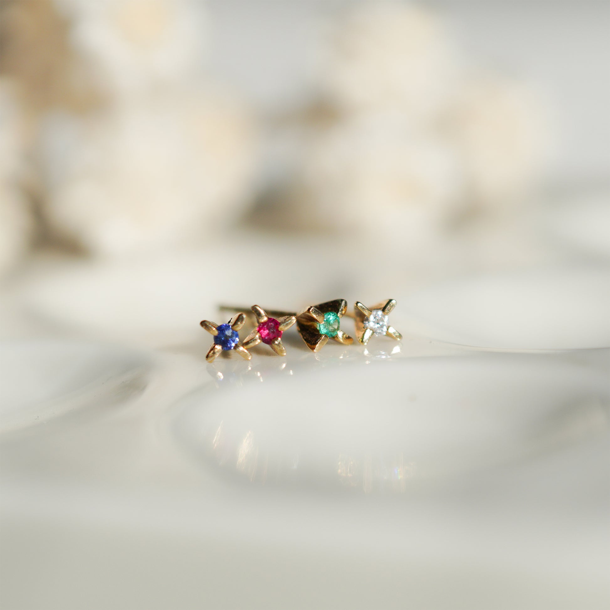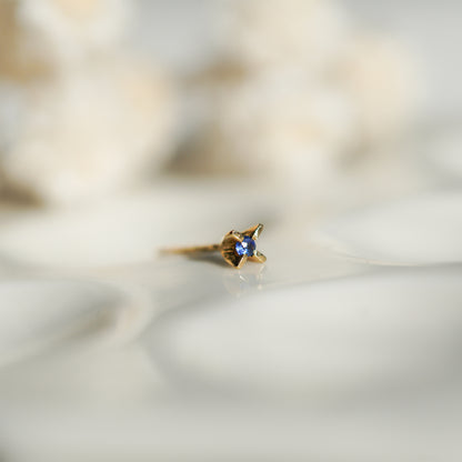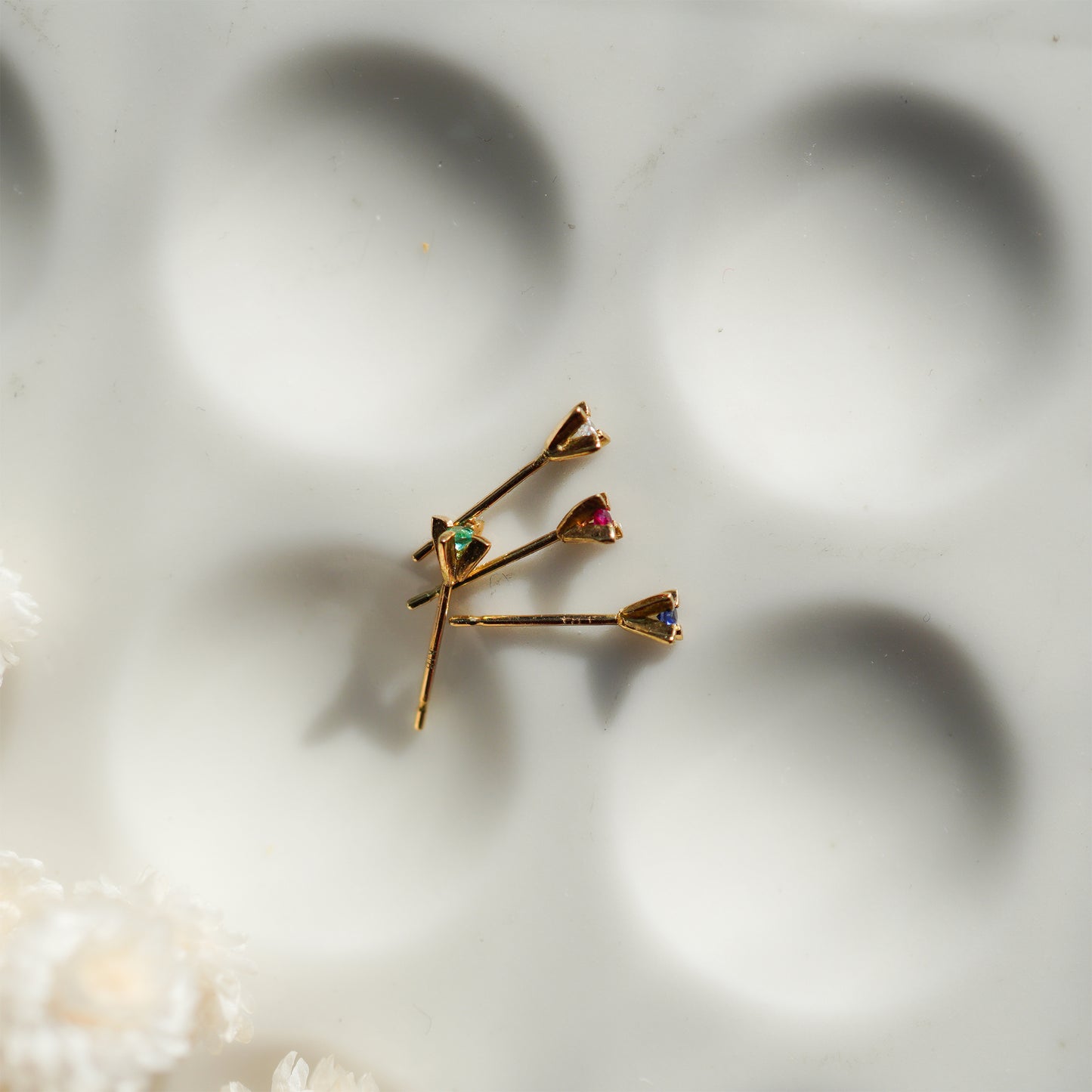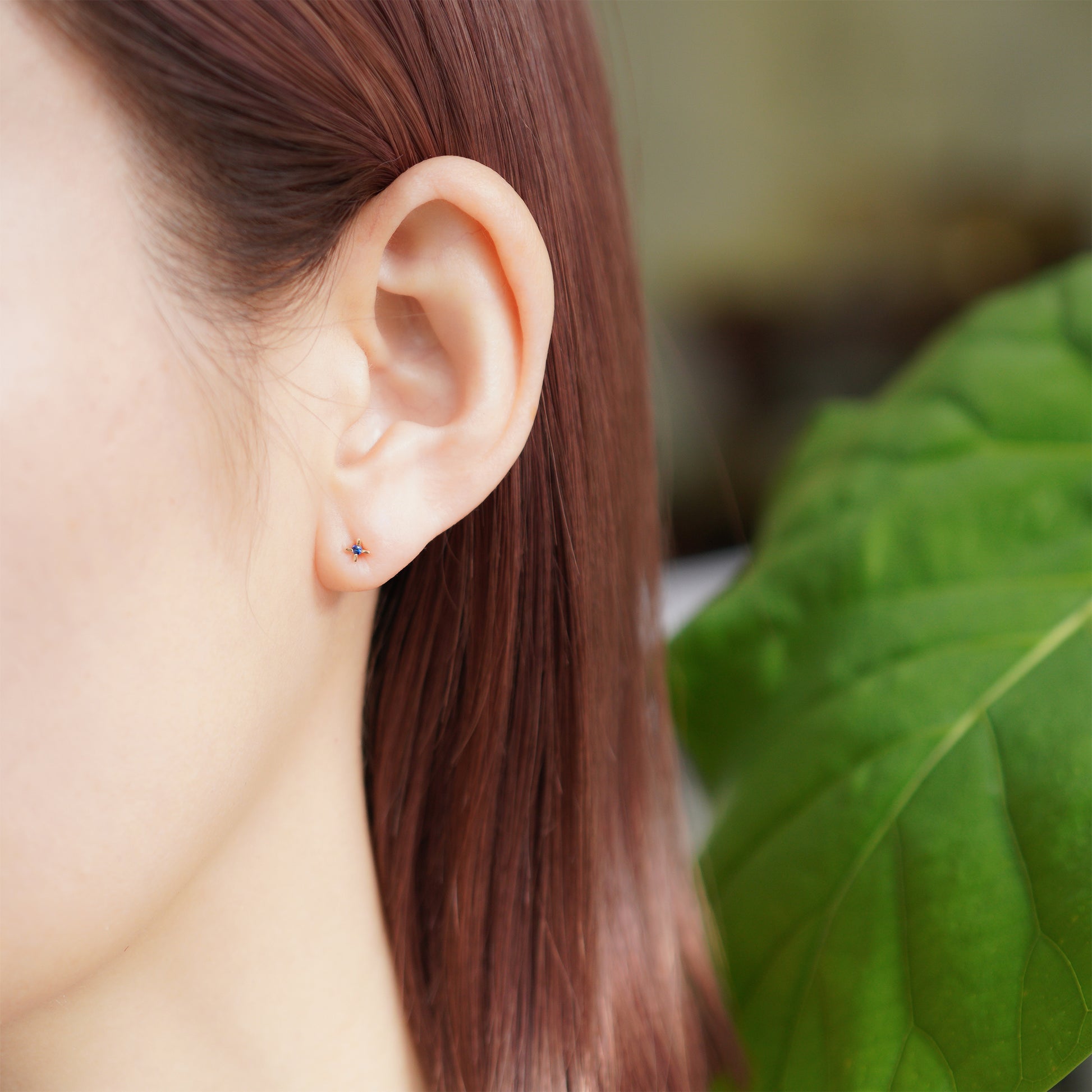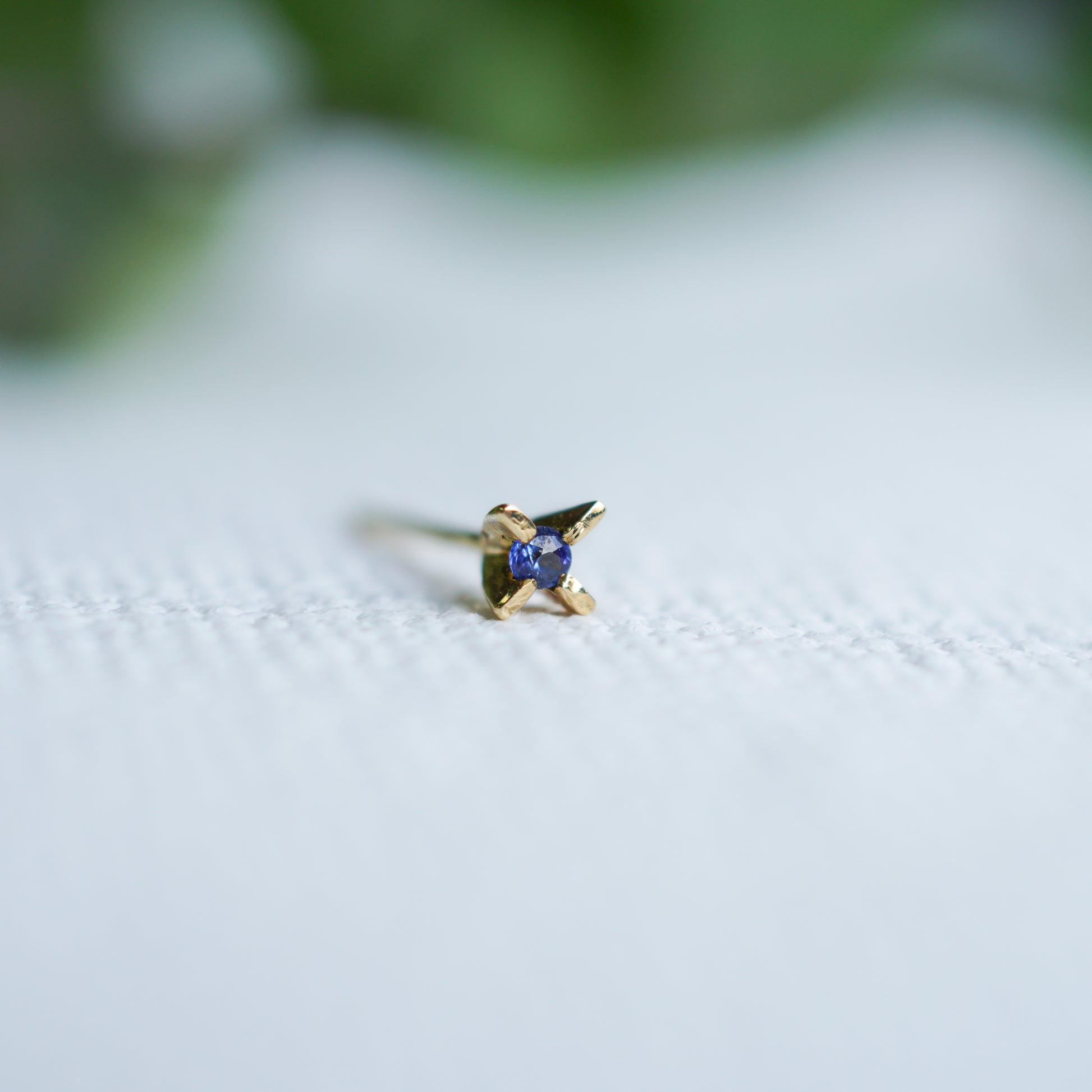 k18ゴールドのミニ立て爪サファイヤピアス。小さいながらも耳もとできらりと輝き、さりげない存在感を演出。シンプルで年齢を問わず身に着けていただけるので、ギフト・プレゼントにもぴったりです。