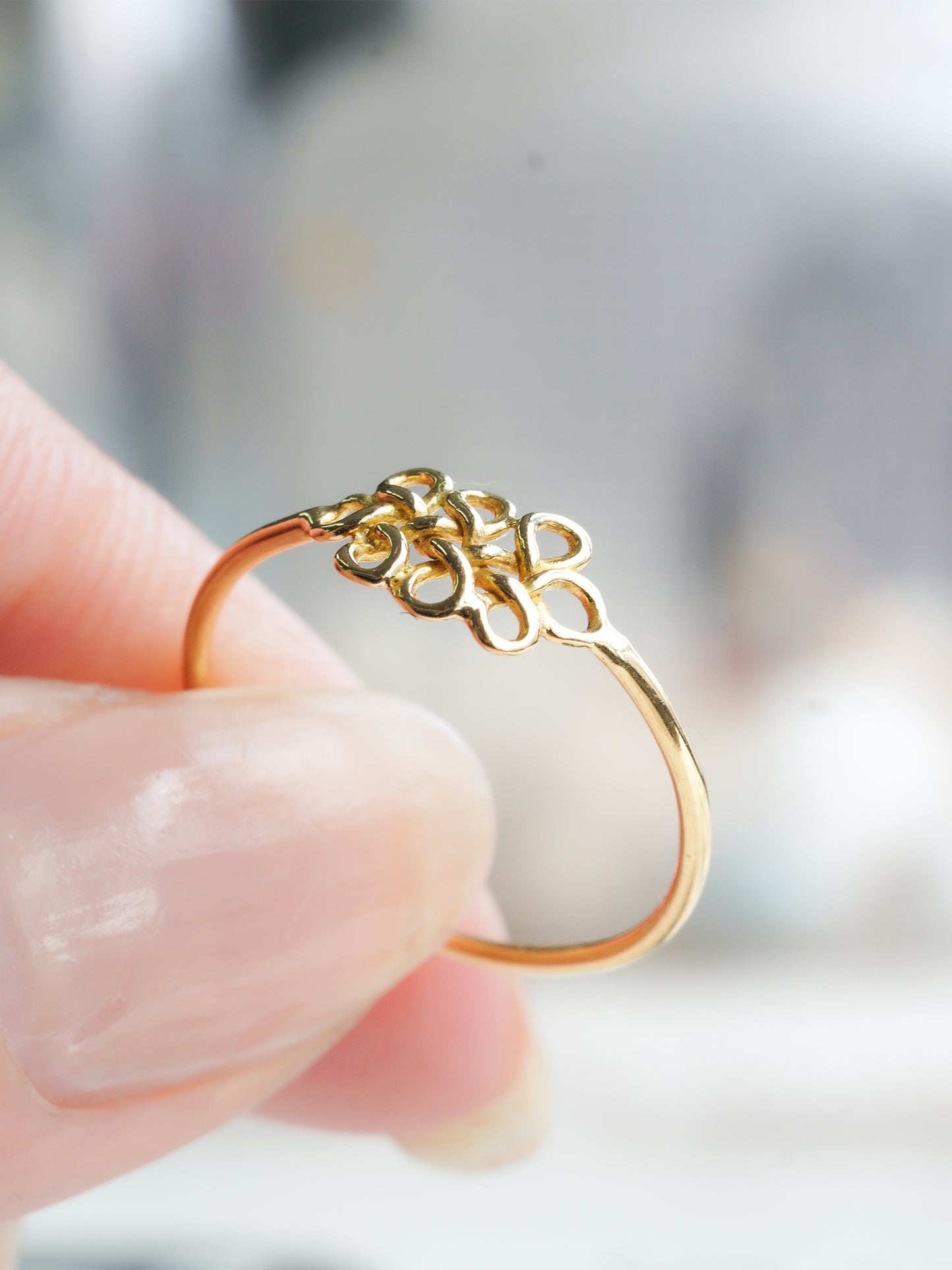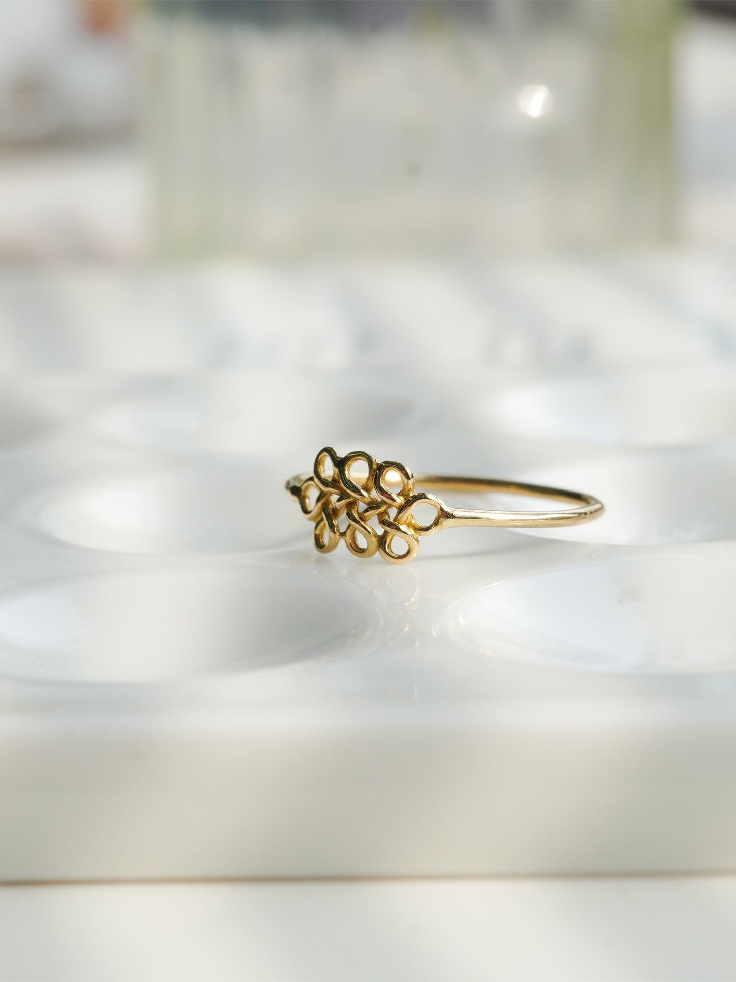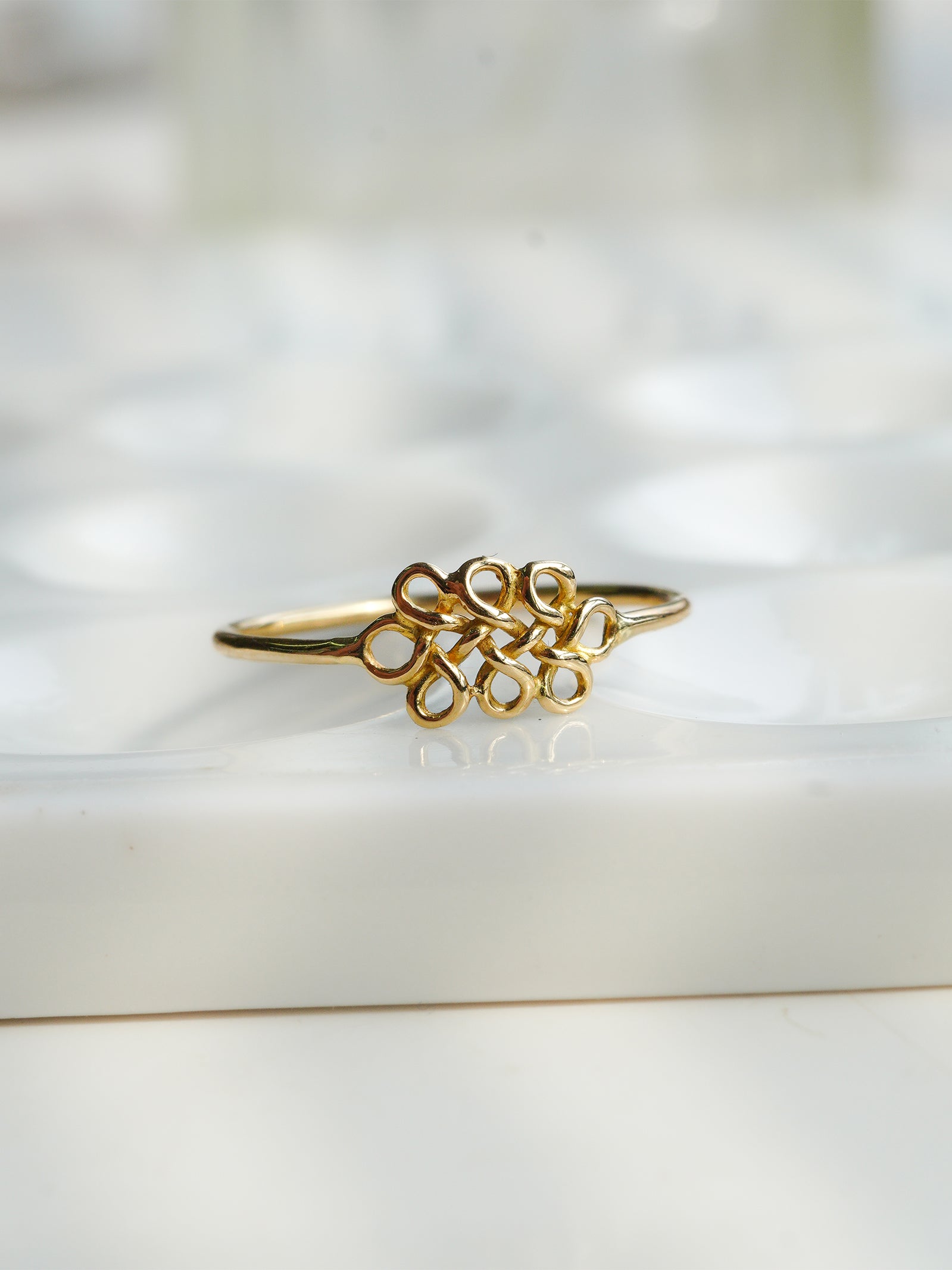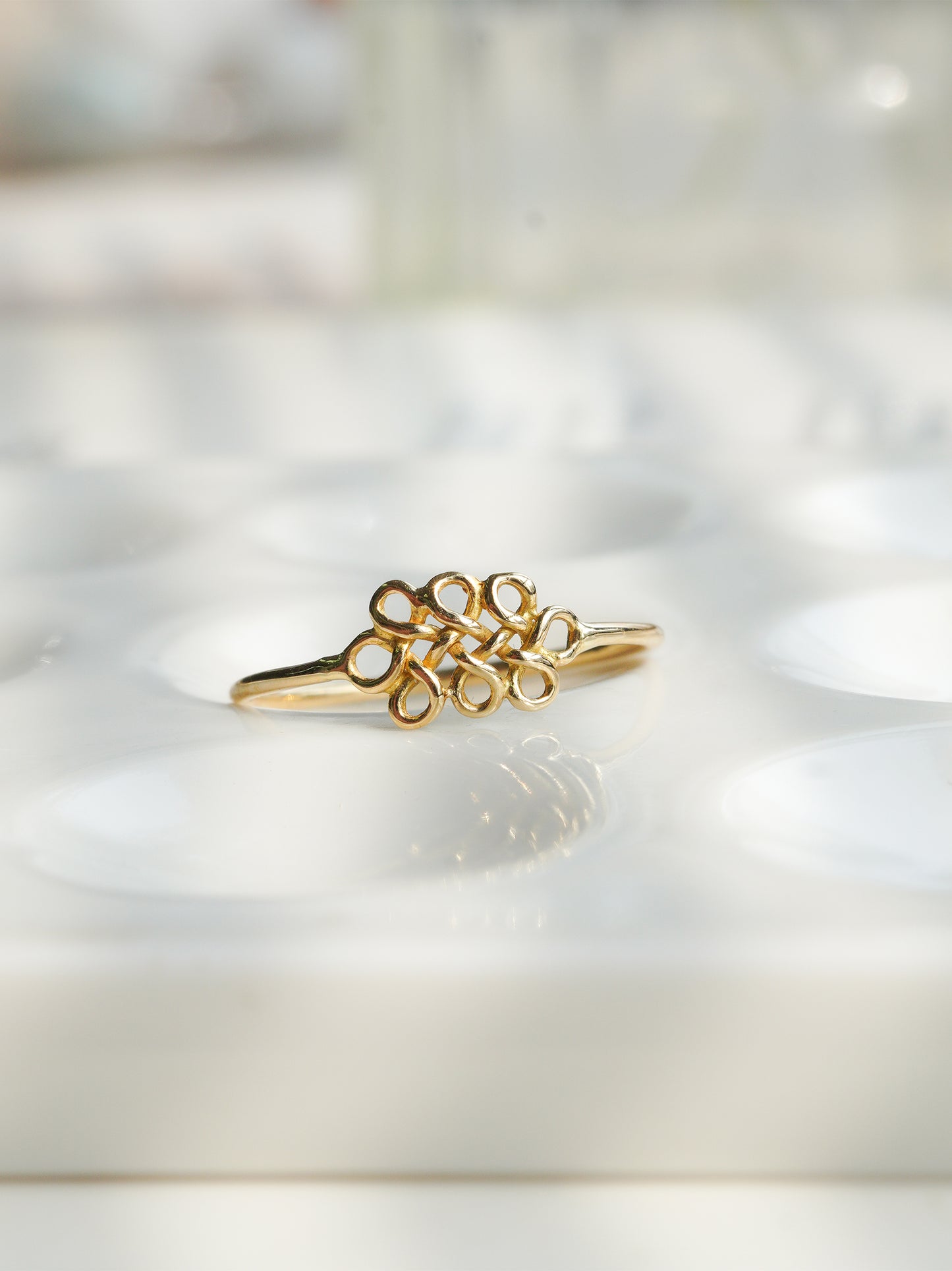 エンドレスノットをモチーフにした、ゴールドのリング。