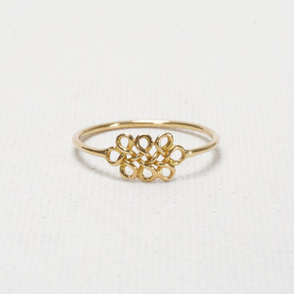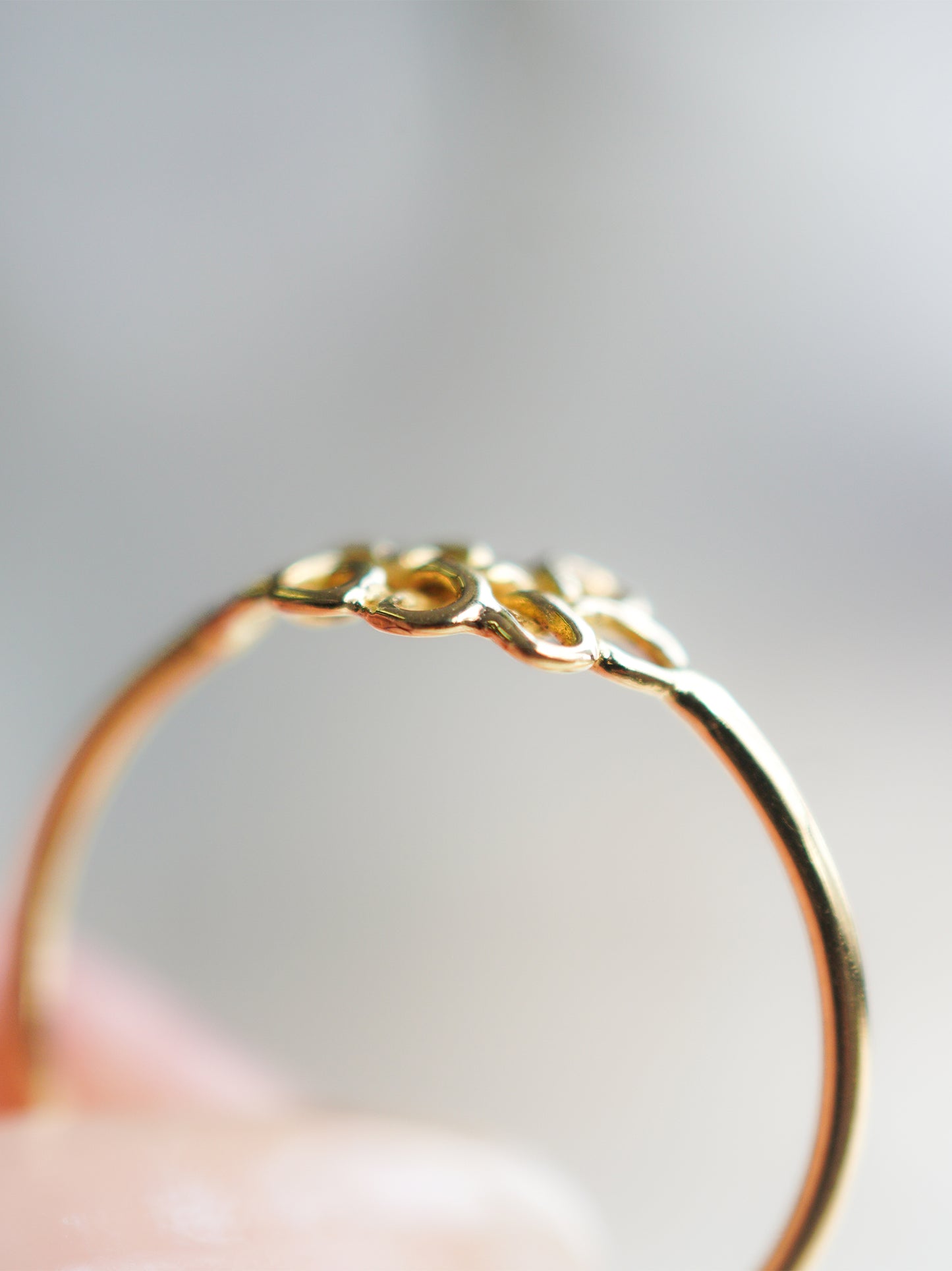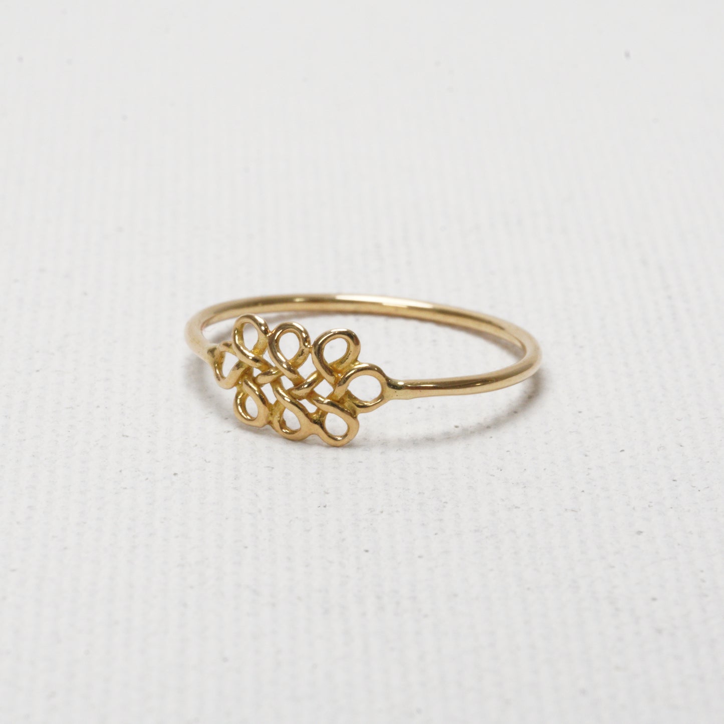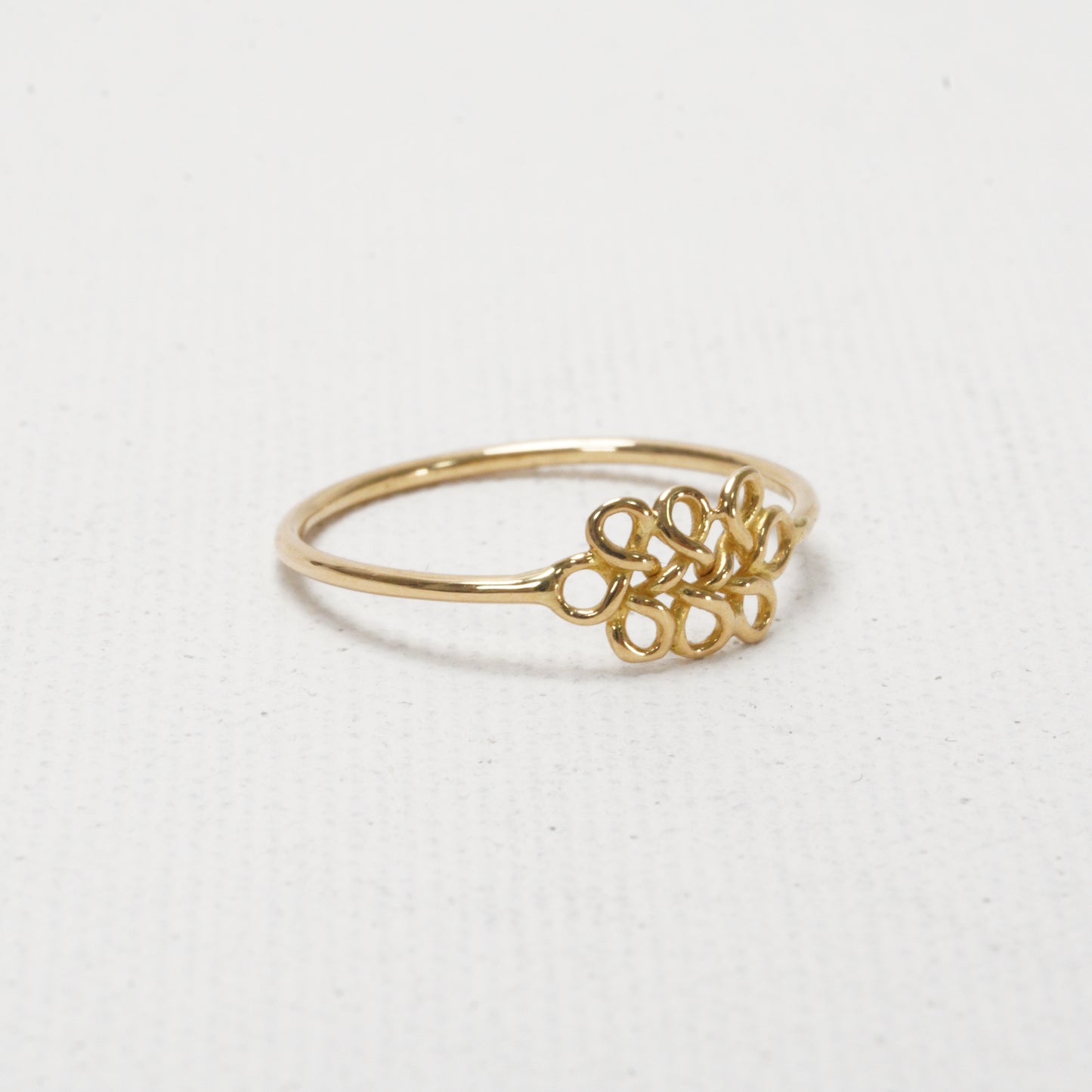 エンドレスノットをモチーフにした、ゴールドのリング。