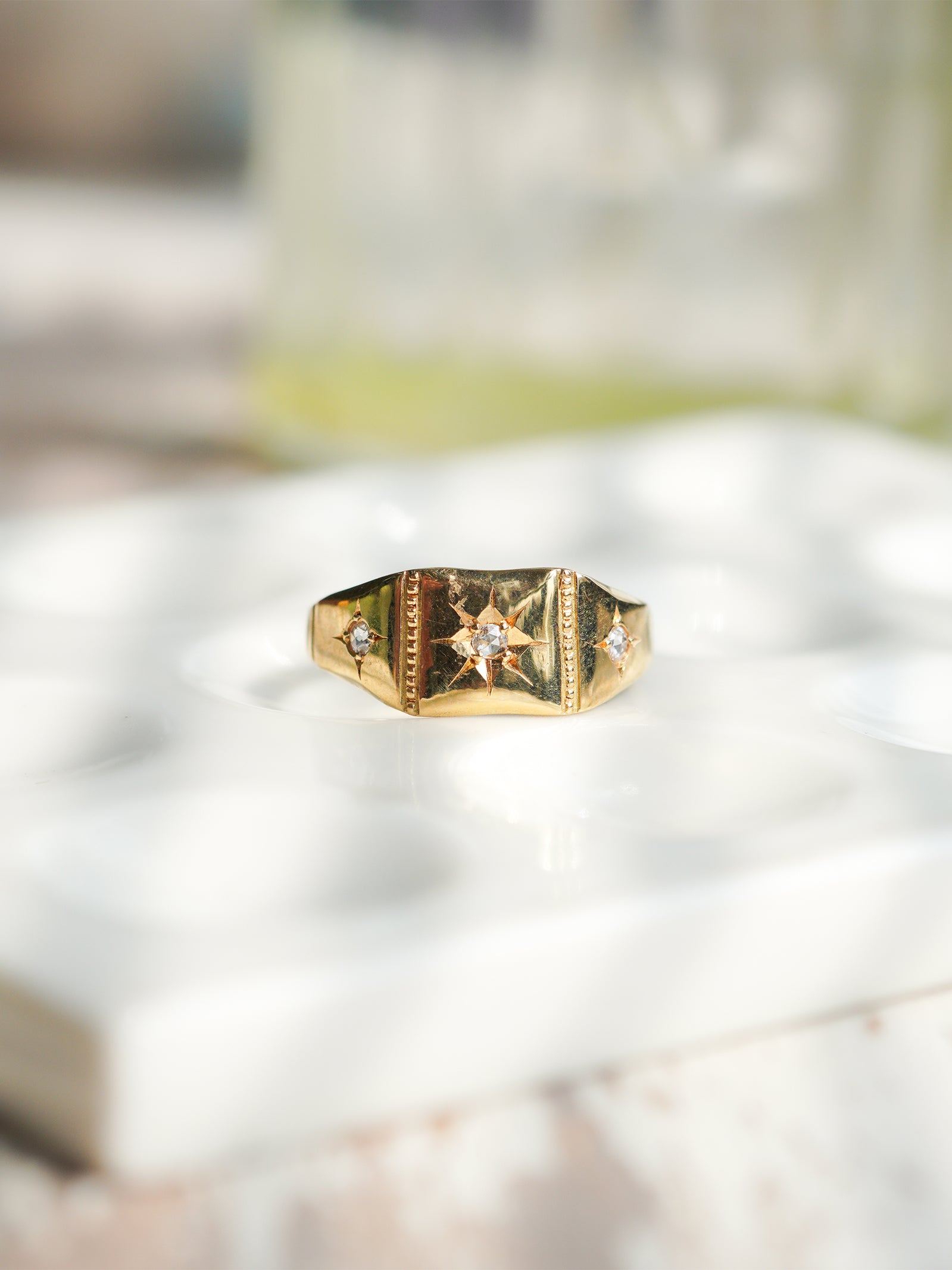 ダイヤモンドが3石星留めで施され、少しアンティークのような雰囲気も。