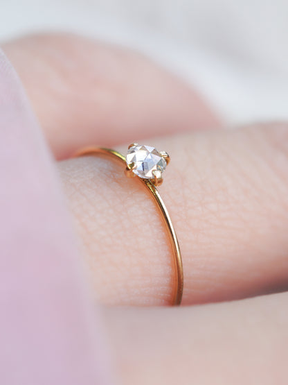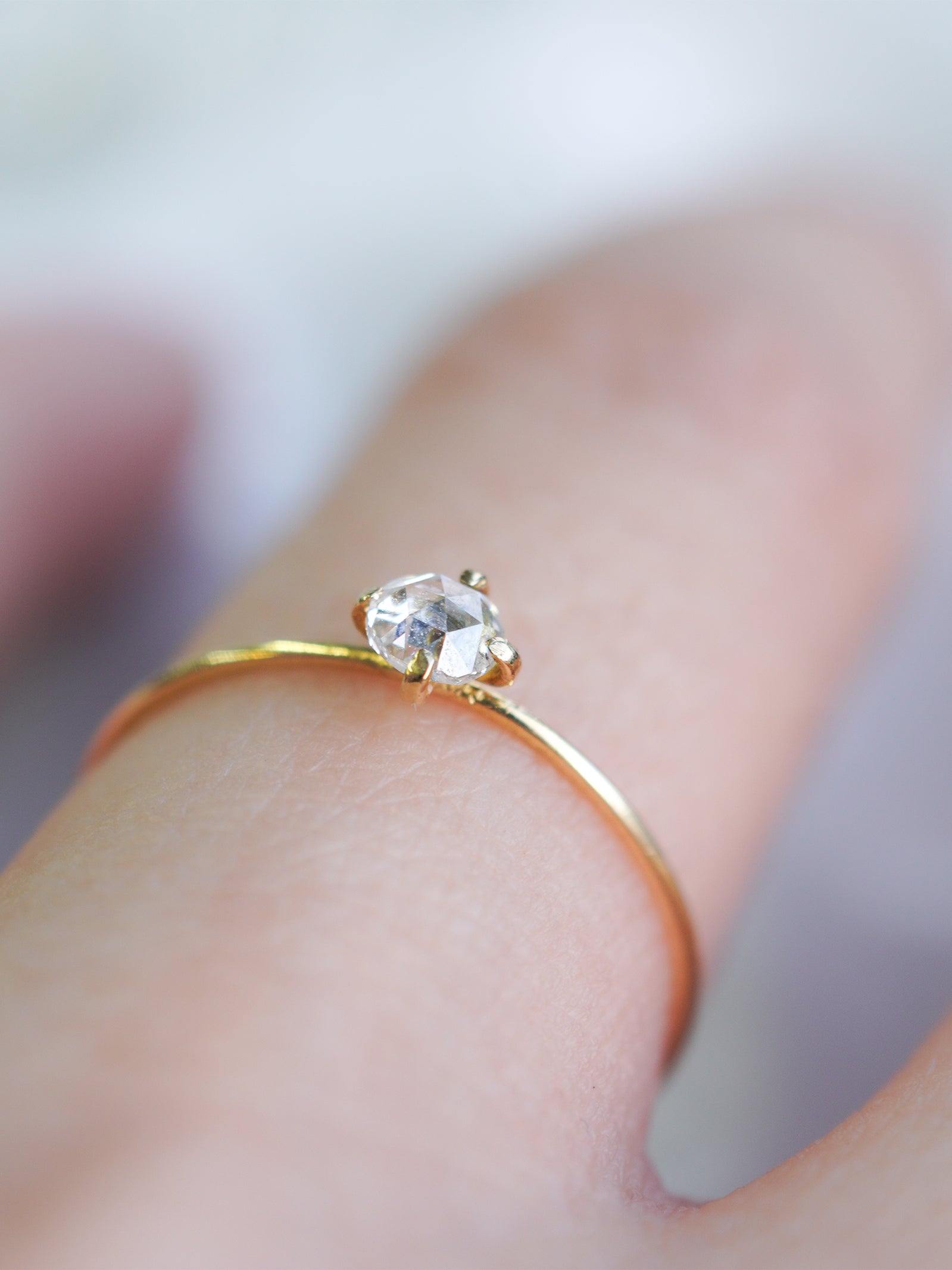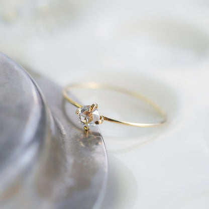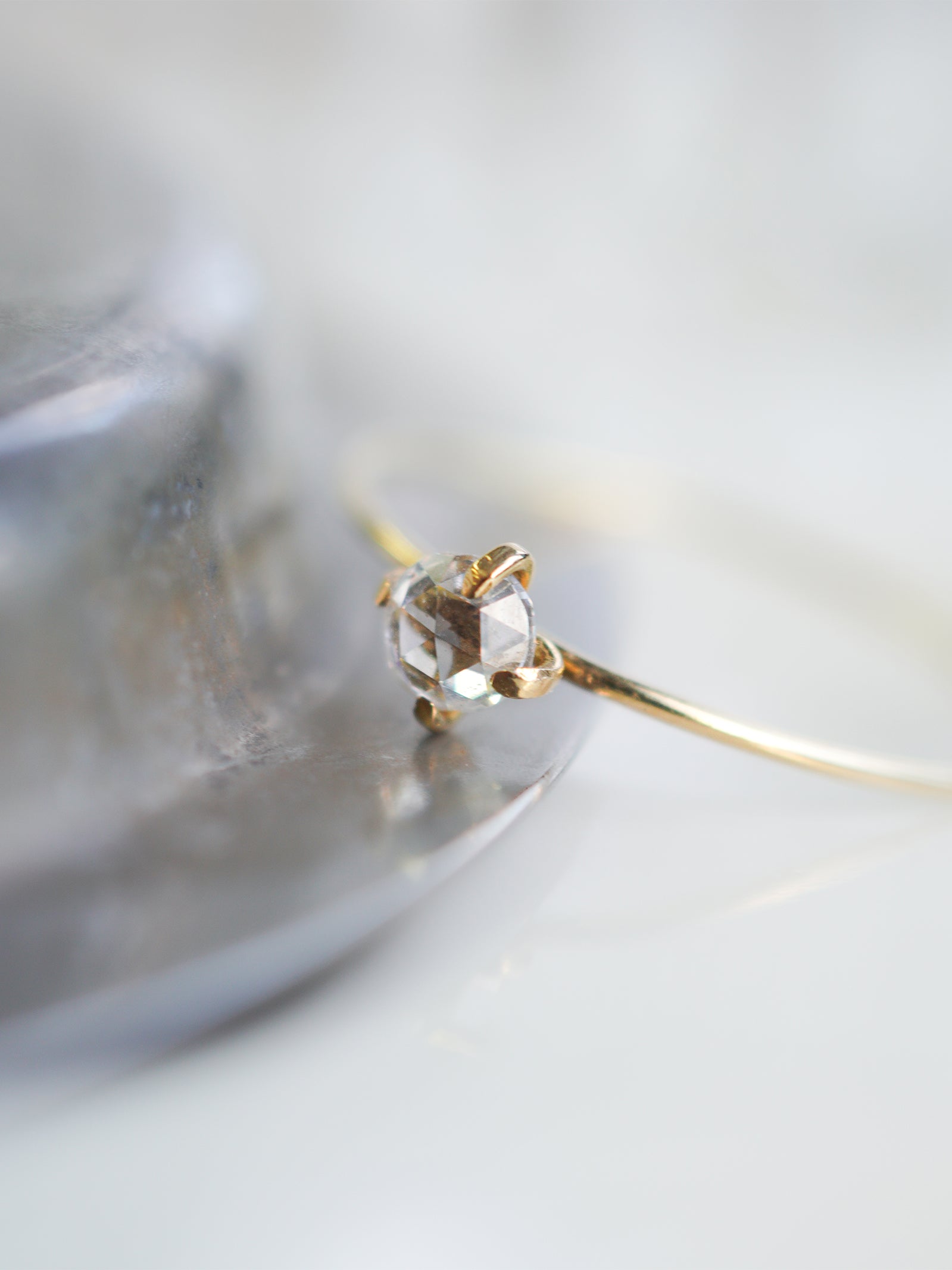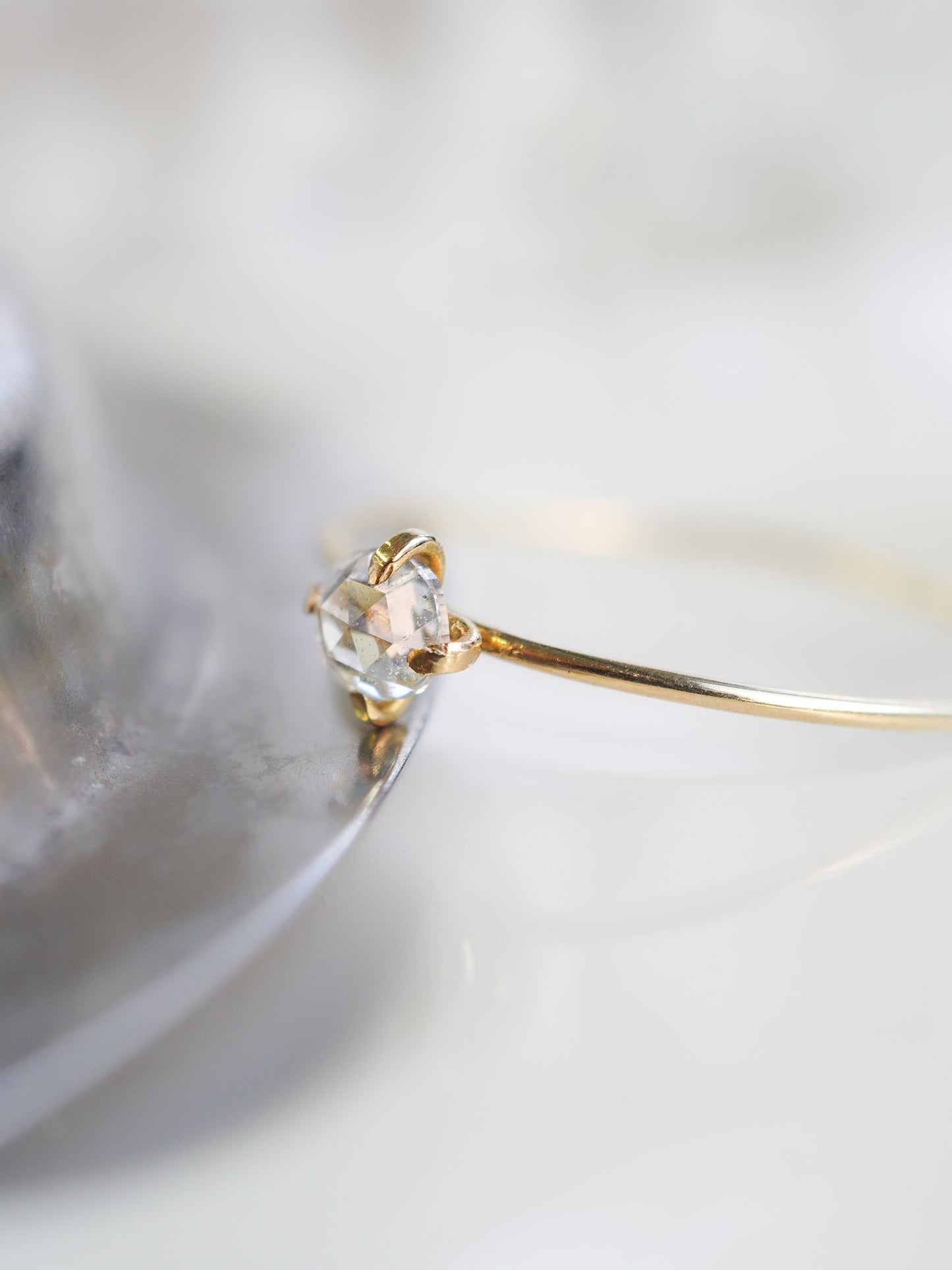 ローズカットのダイヤモンドの輝きを最大限に引き出すよう、華奢な爪にセットされたリング。