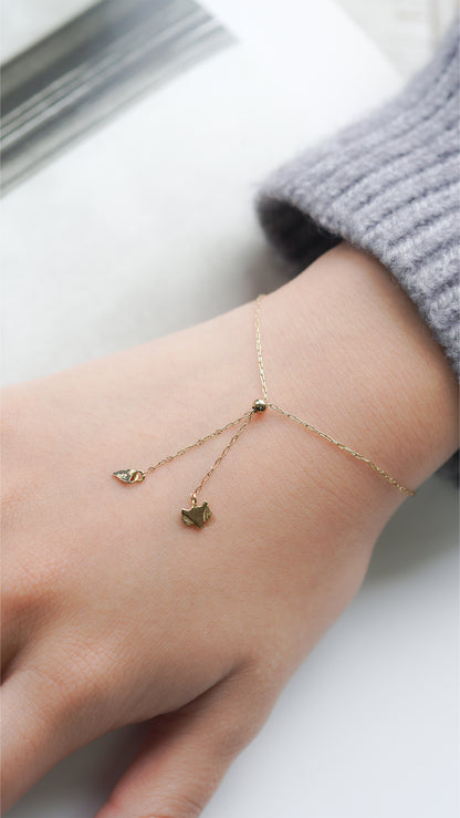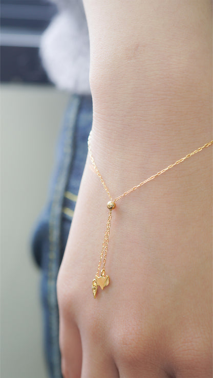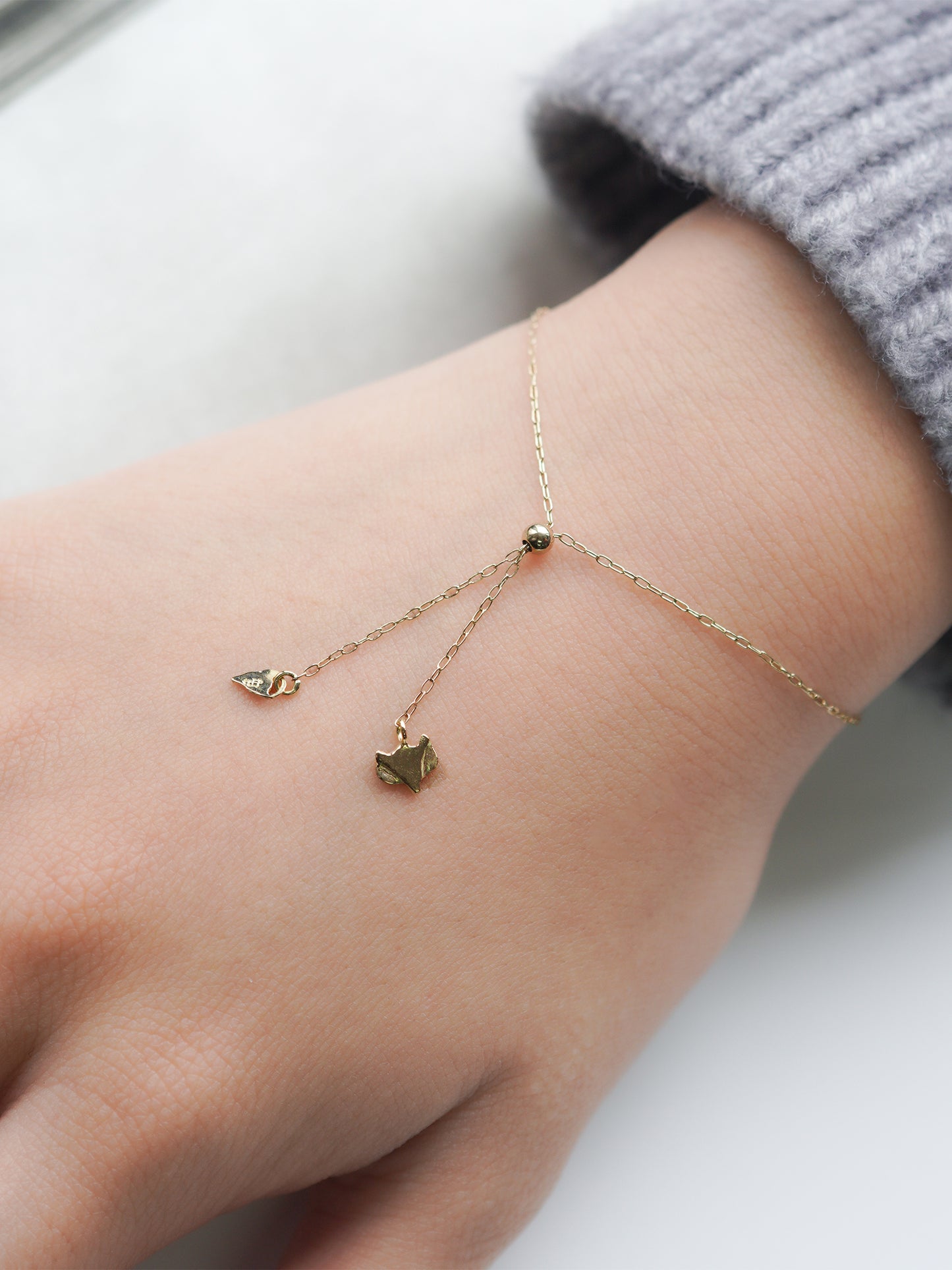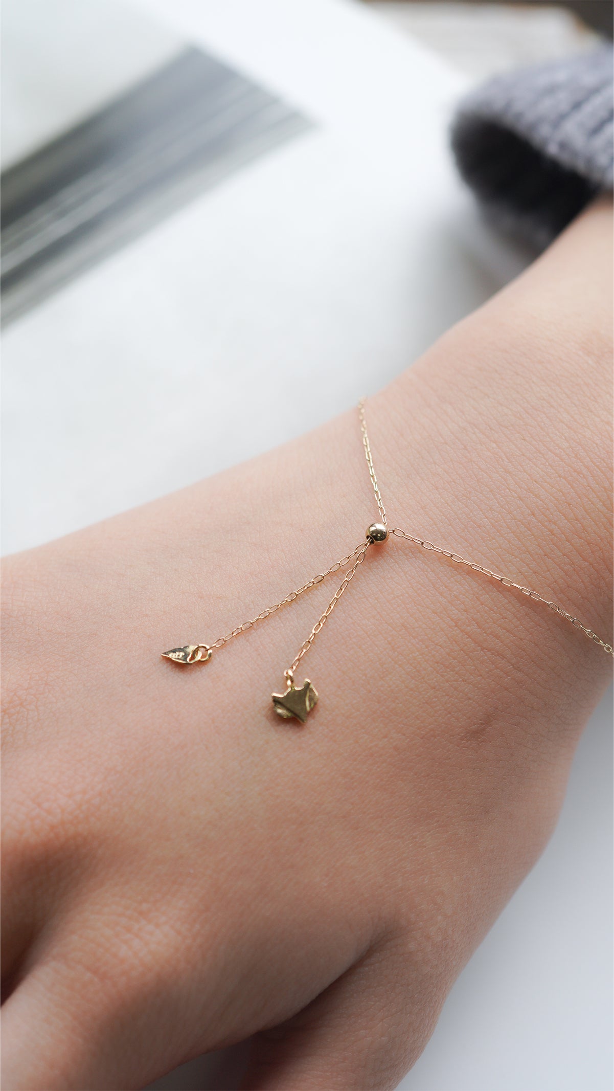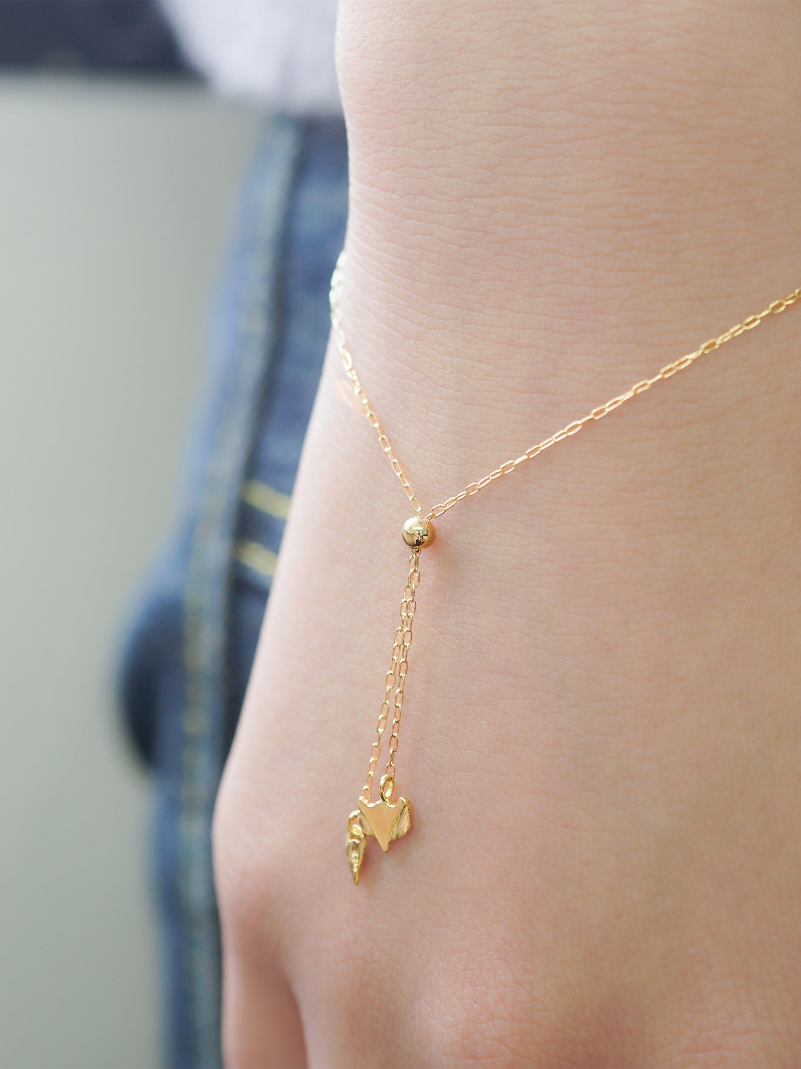 腕に通した後、着用している腕の指でモチーフのついている側のチェーンを固定させ、