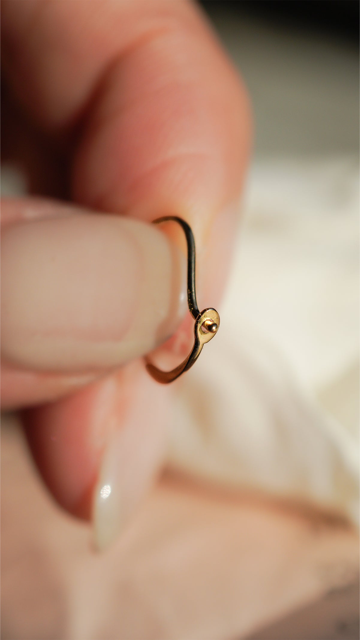動く範囲で横に開くように軽く指で押しながらピアスホールに通してください。縦向きに広げますと変形の原因になります。