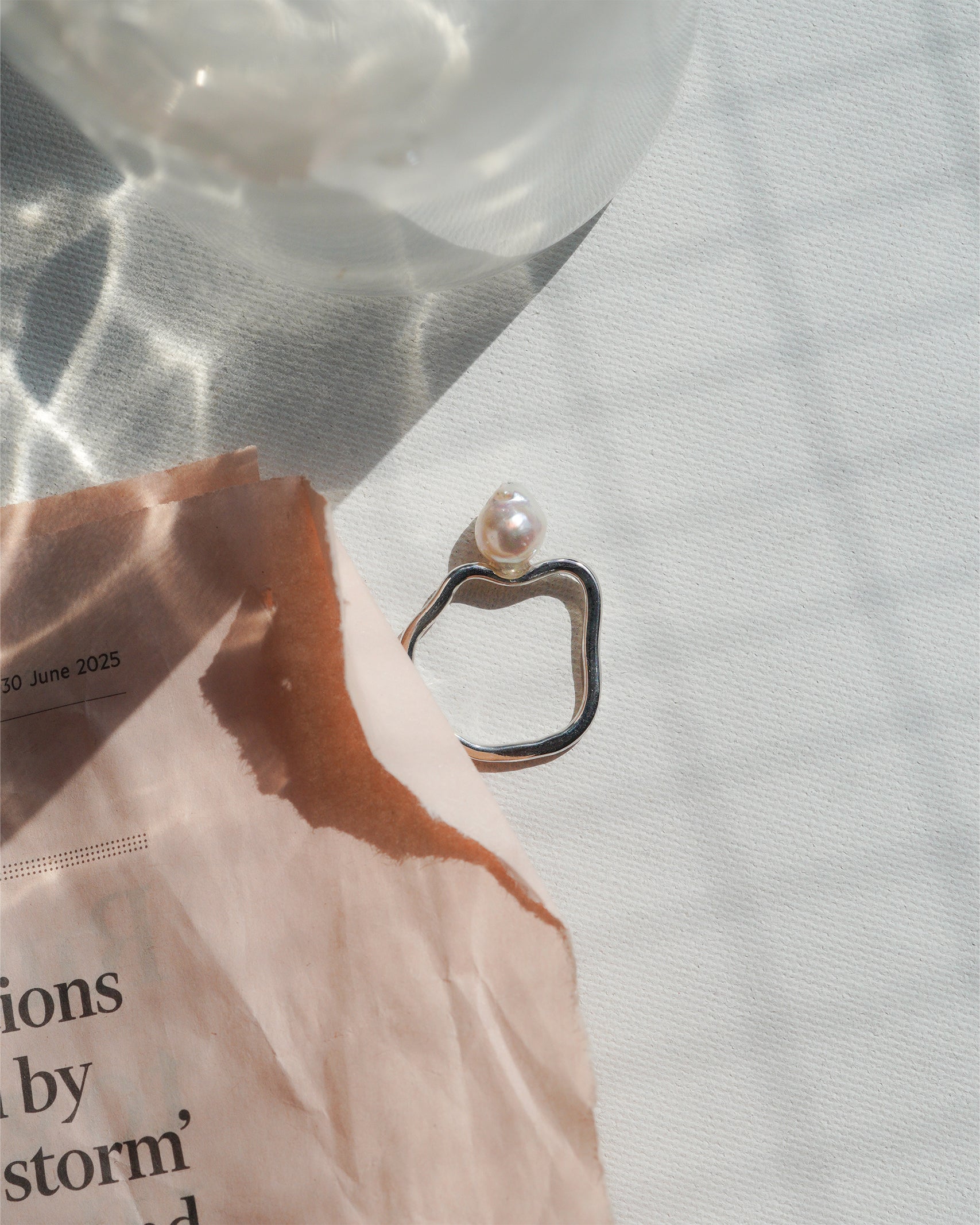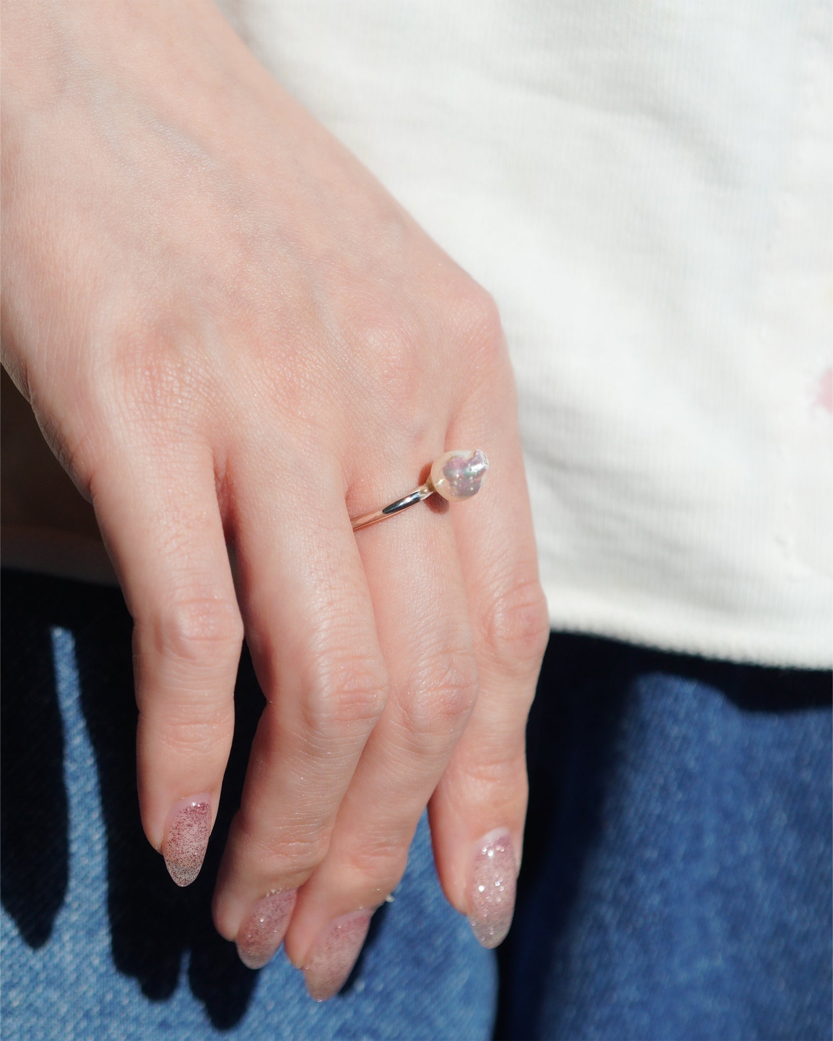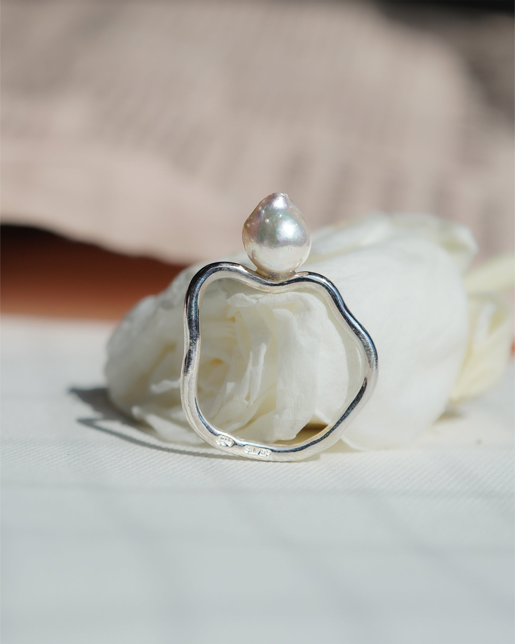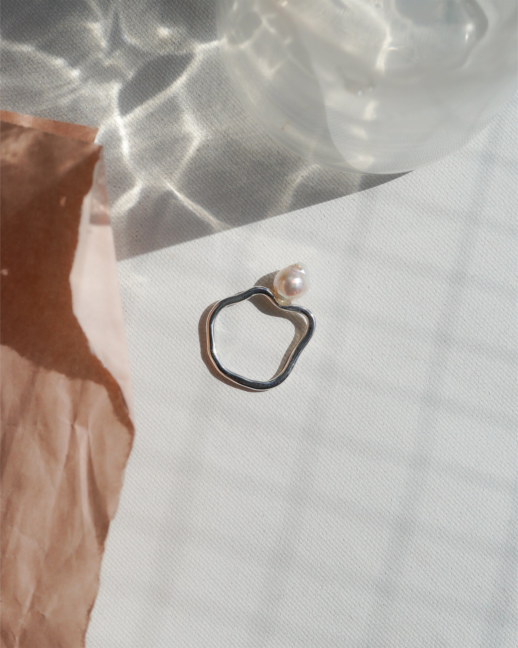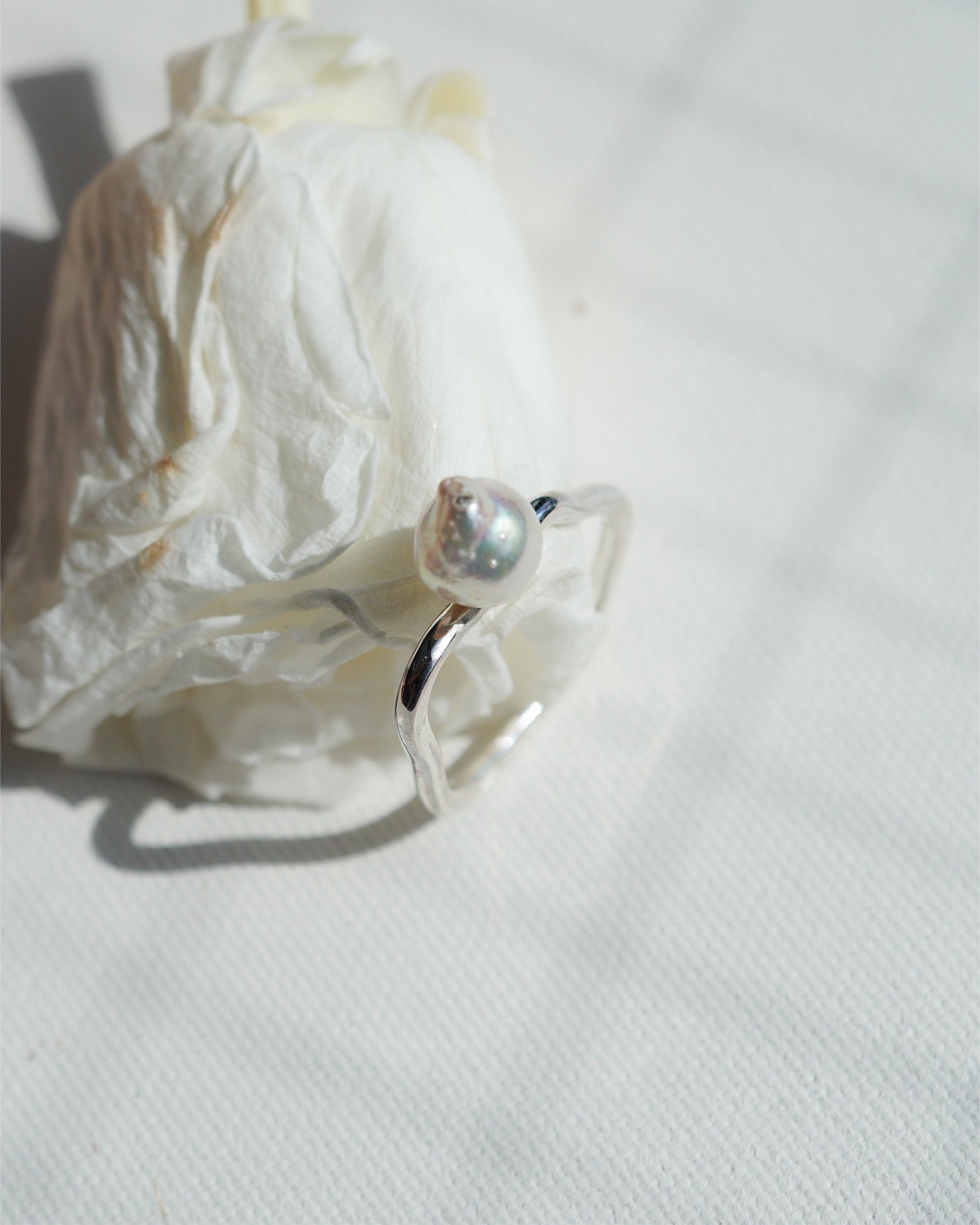 silverの歪なシルエットのリングとアコヤパールのバランスをお楽しみください。