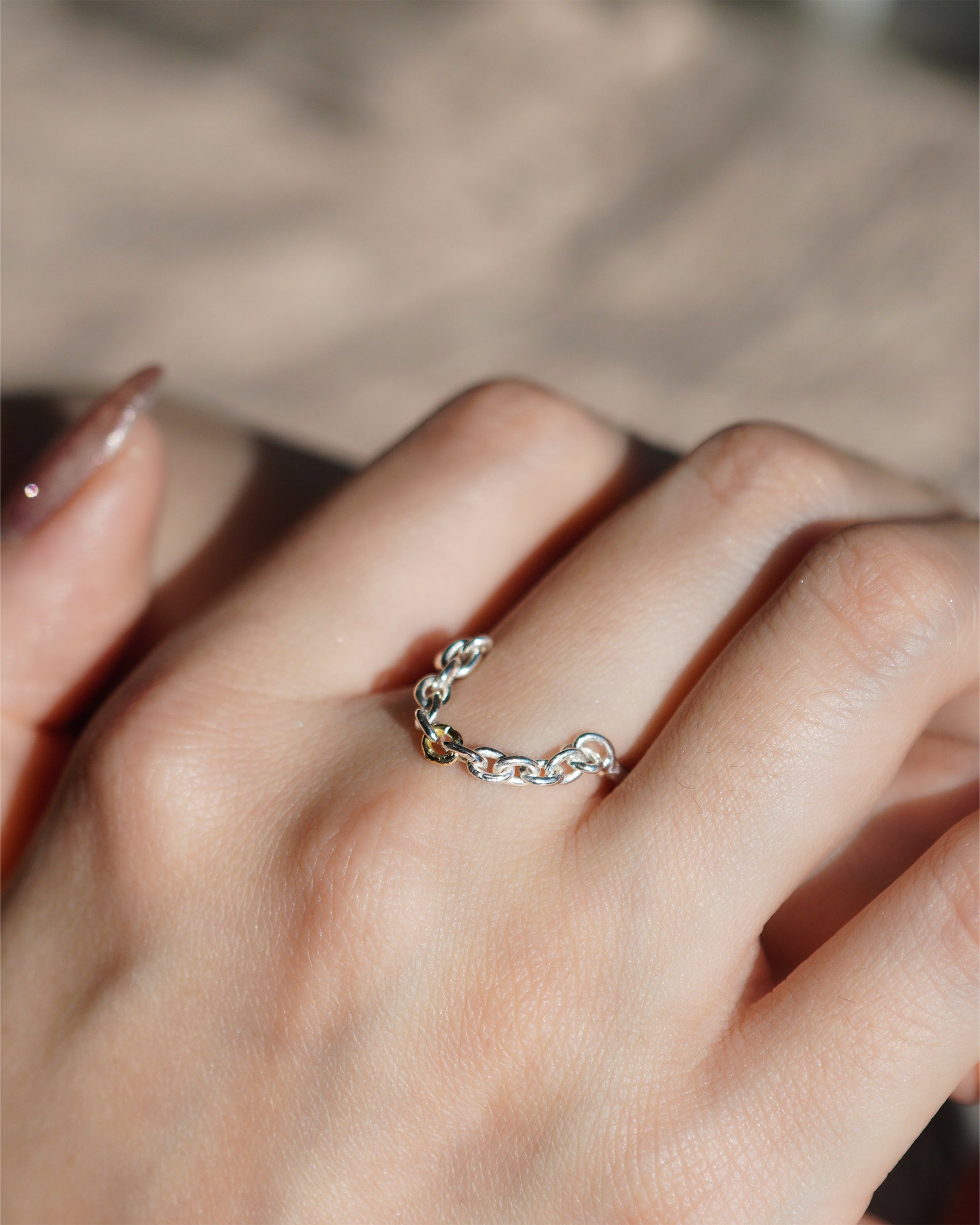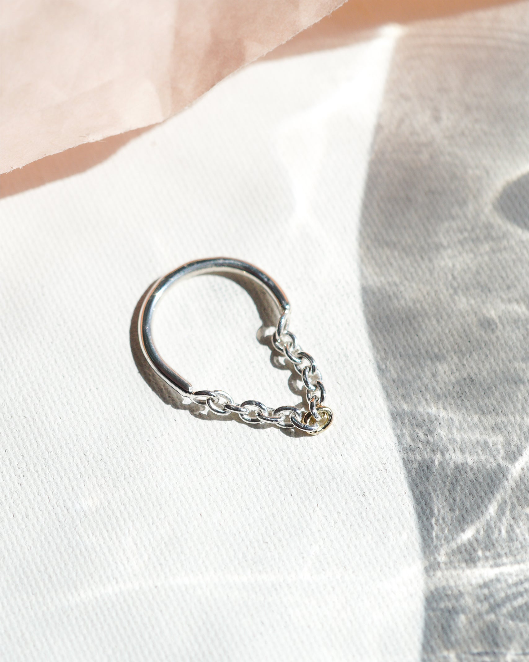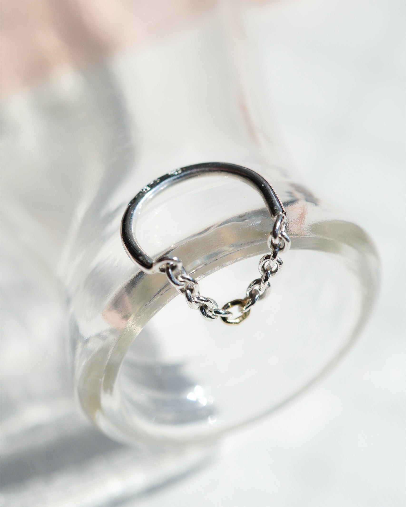 チェーンのデザインではありますが、雨の印象のように爽やかに、ライトに着用いただけるチェーンリングです。silverと18Kの両素材ともコーディネートをお楽しみください。