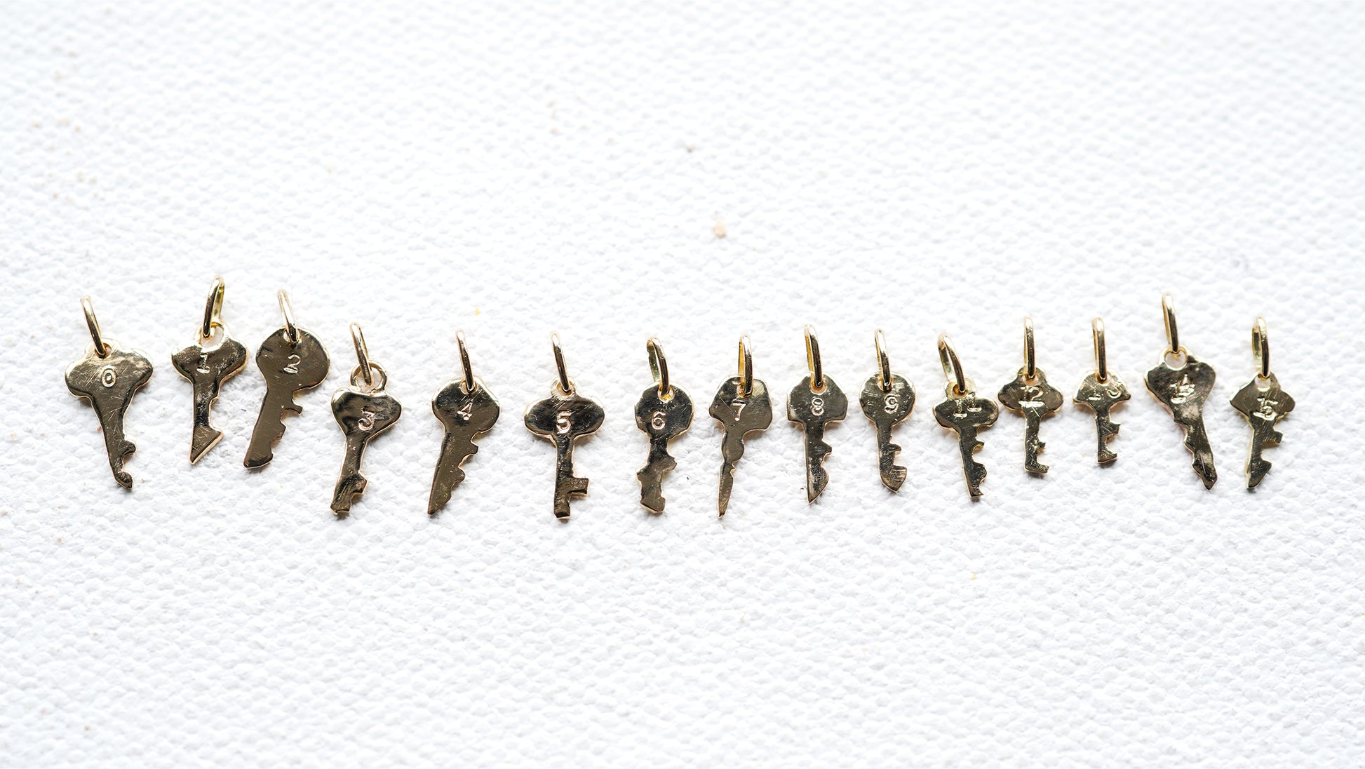 数字の刻印(0〜15)が施された"鍵"のチャーム。